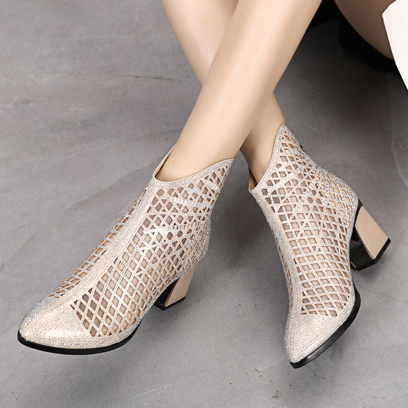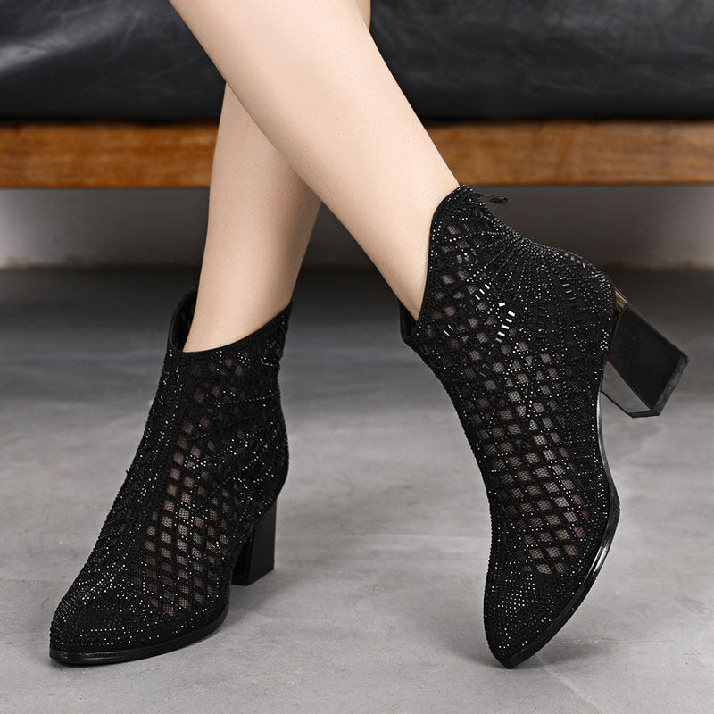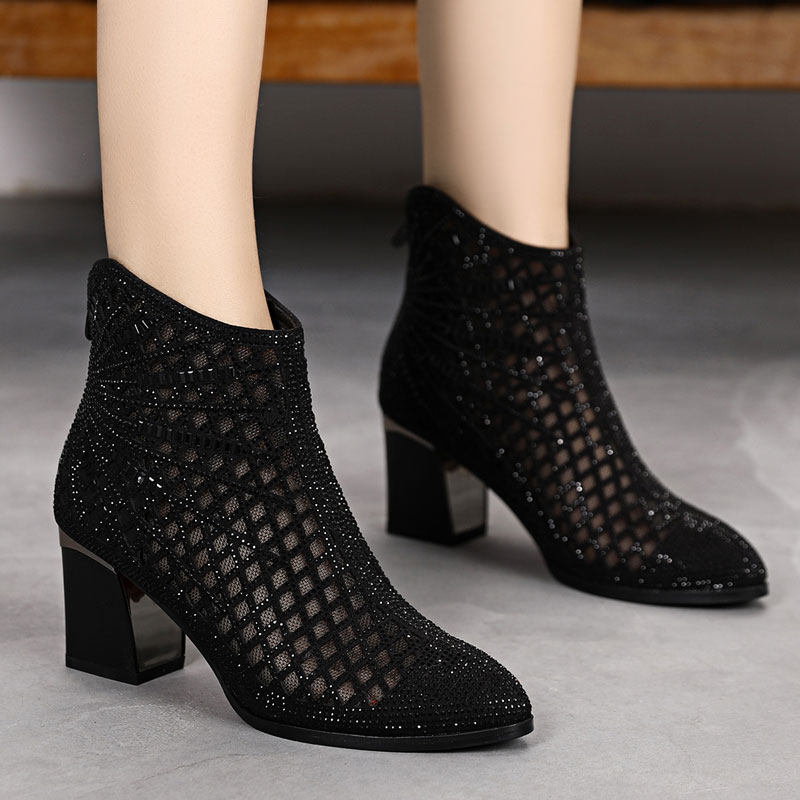 Spring Summer Women Shoes Hollowed-out Coarse Heel Short Boots Woman Spring Autumn Single Boots Mesh Boots Mesh Yarn Boots High Heel Sandal Boots Large Size 41