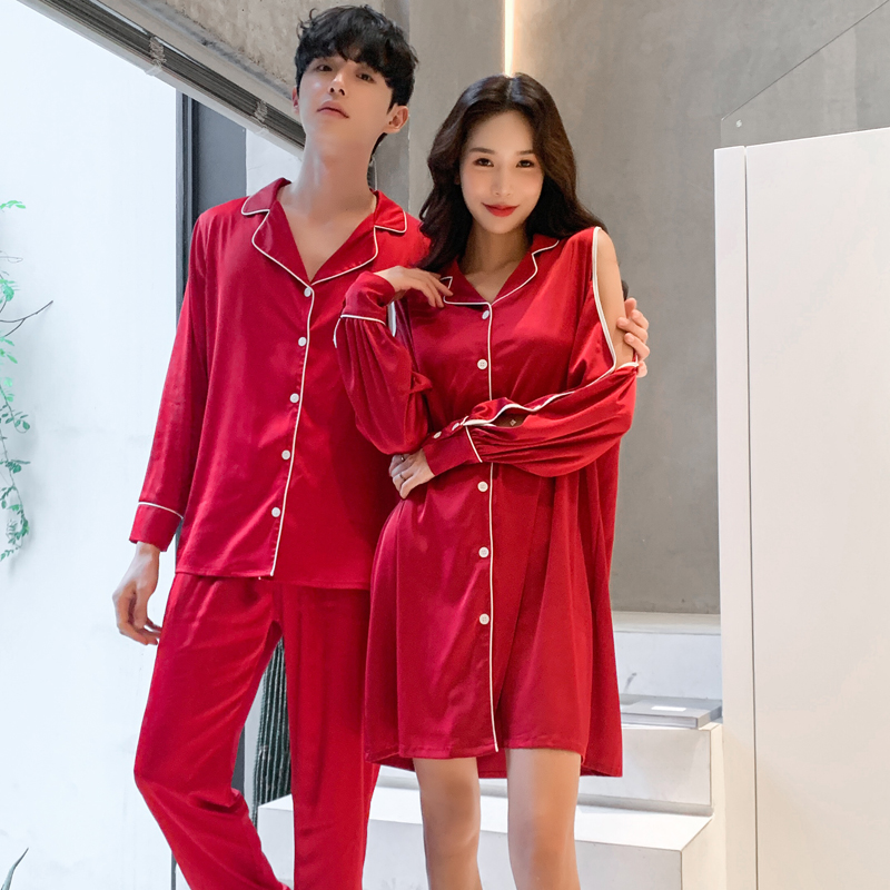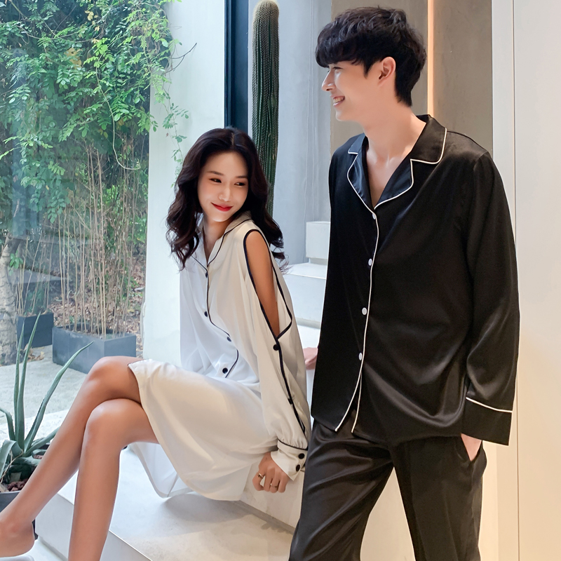 Pajamas women's spring and summer ice silk silk night dress sexy off-the-shoulder thin section couple long sleeve casual men's home wear suit