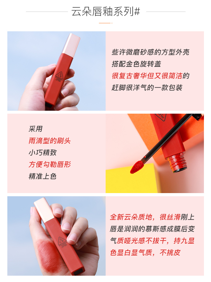 3CE cloud water lip glaze taupe matte velvet matte mousse lipstick on the run princess red rotten tomato plum color