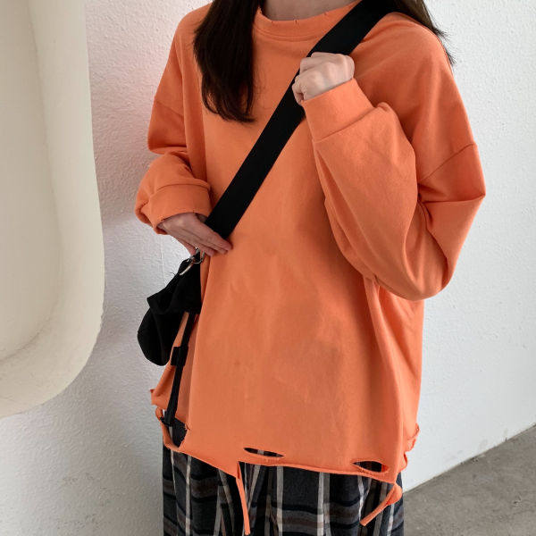 ins breaking hole long sleeve T-shirt female Korean version loose with little crowd design feel 100 hitch fashion foreign pie undershirt trampoline blouse