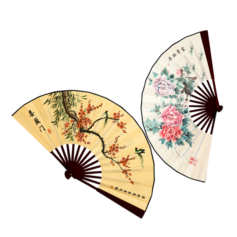 Ancient costume cloth folding fan 10 inches 8 inches classical white yellow rich peony flowers and birds male and female students opera performance silk cloth fan
