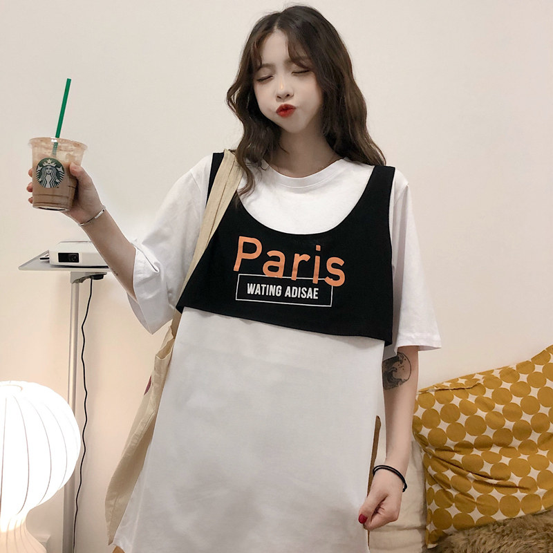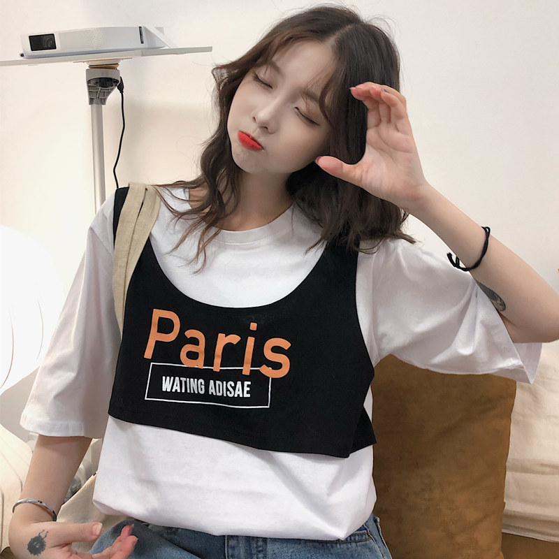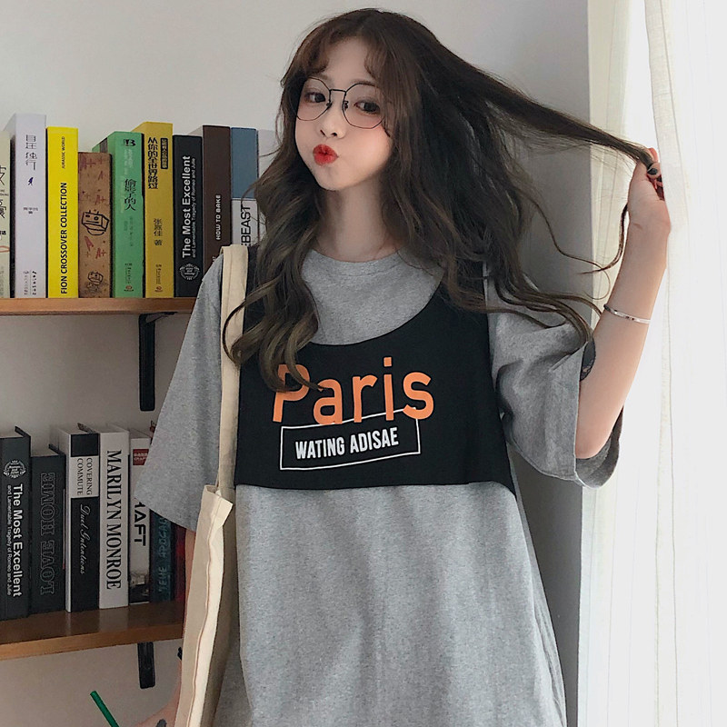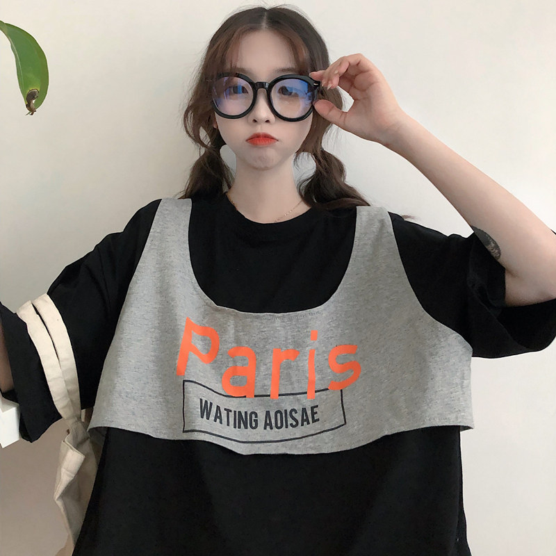 American T-shirt female short sleeve 2020 new female loose Korean version of summer half sleeve long version fake two blouses