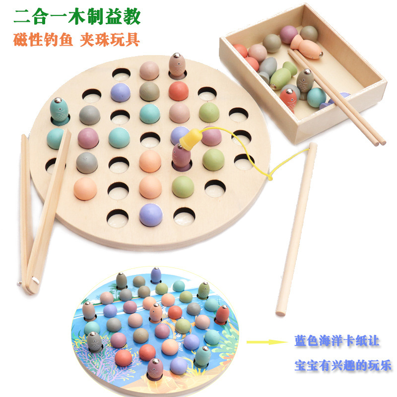 Wooden magnetic clip beads fishing puzzle beaded four-in-one toy to exercise baby's hand-eye coordination and concentration