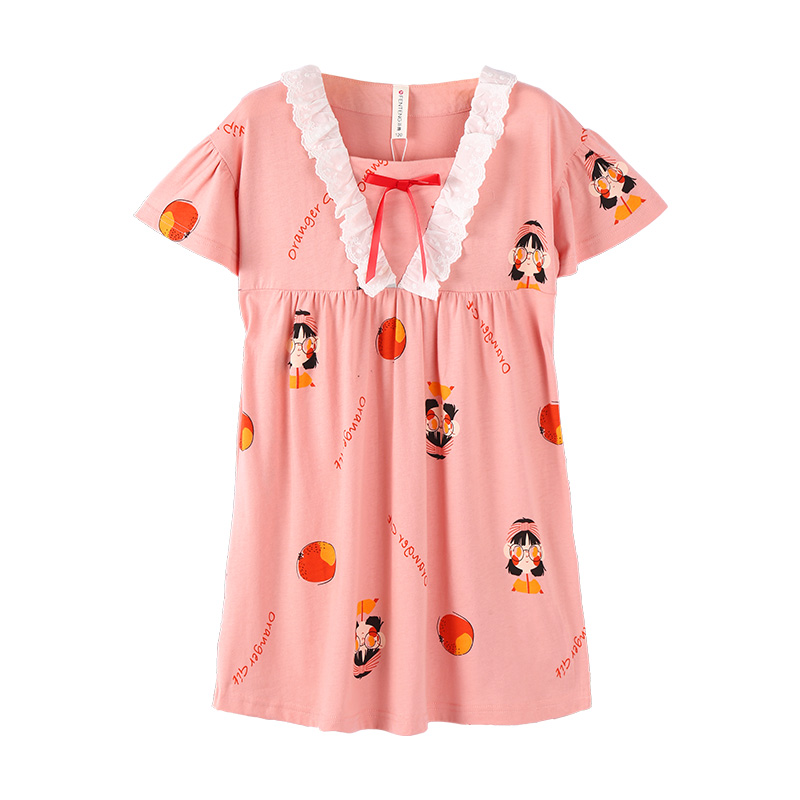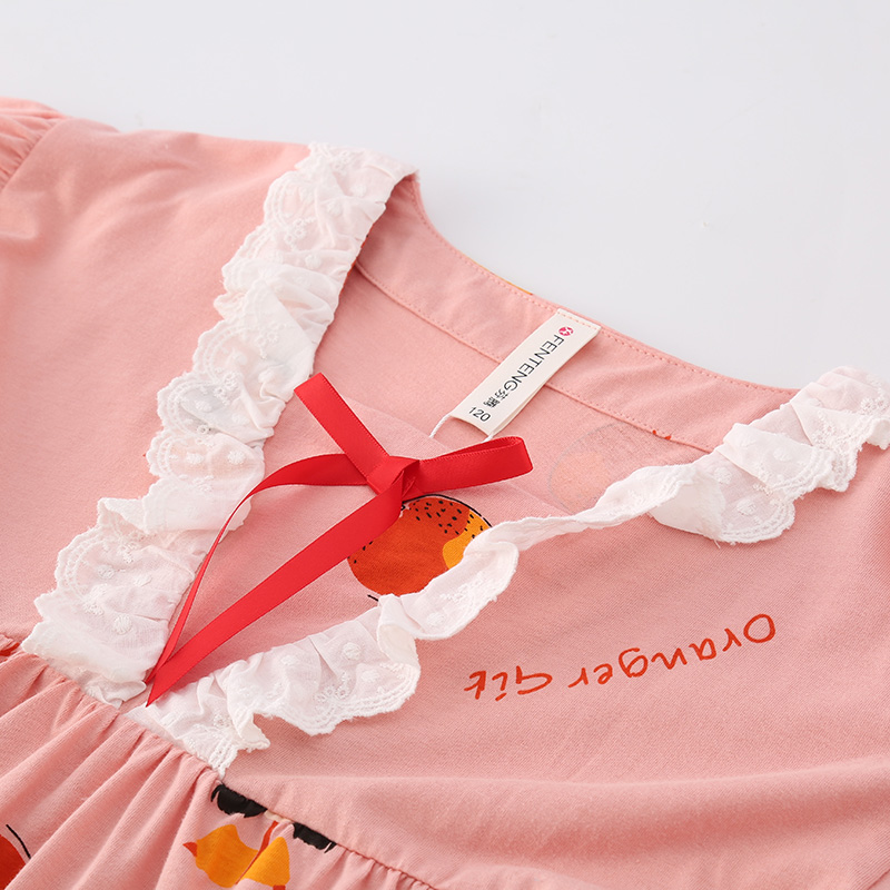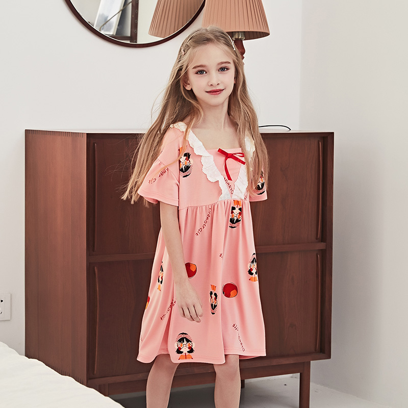 Fenteng summer thin short-sleeved night dress girls pure cotton sweet cartoon girl dress Large children's home clothes