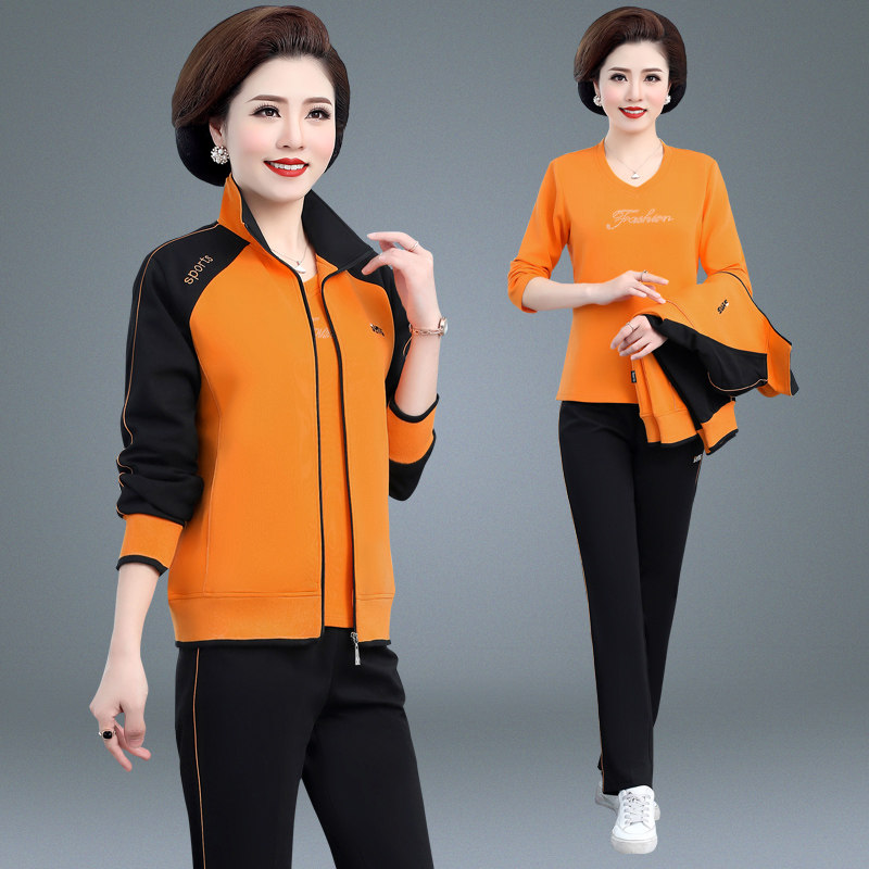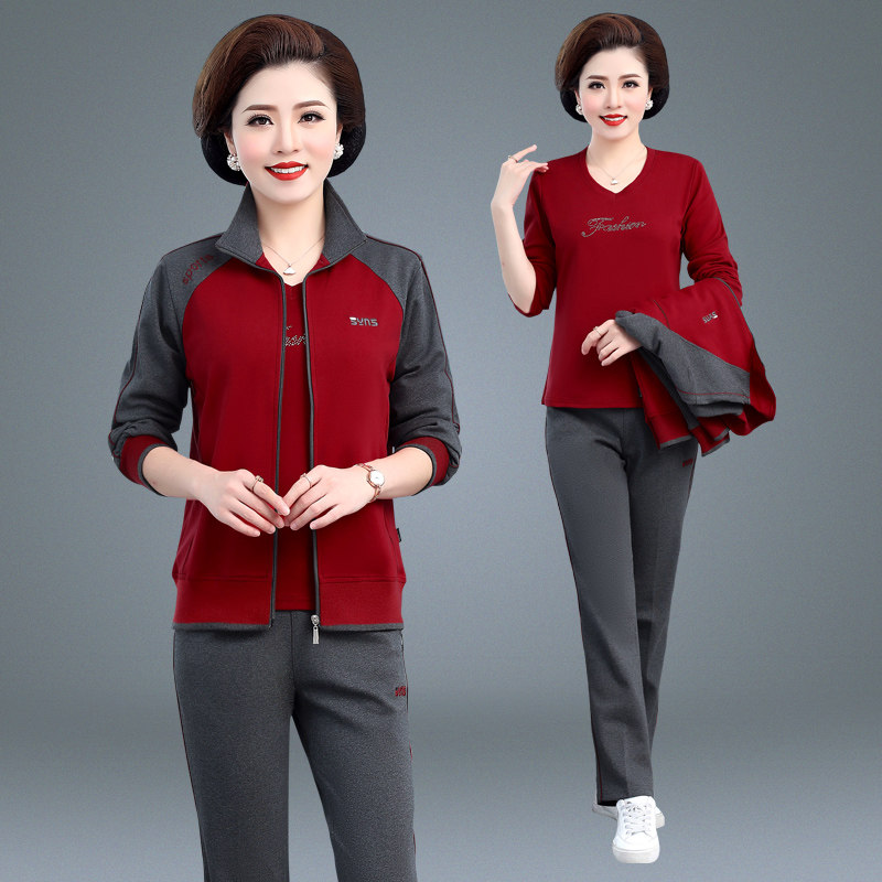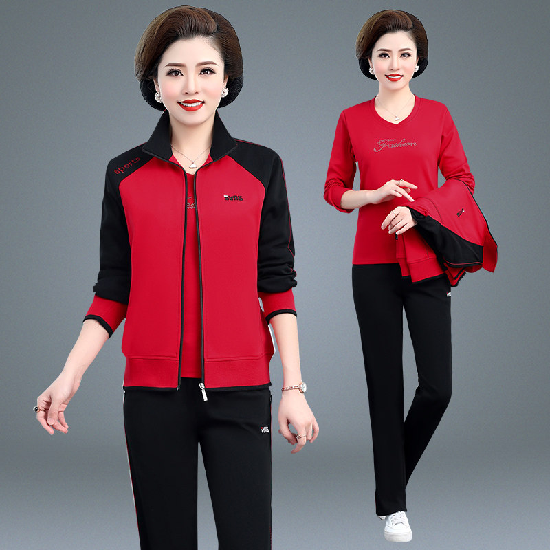 Middle-aged and elderly sportswear suit Large size color middle-aged women spring long-sleeved three-piece set mom spring and autumn jacket