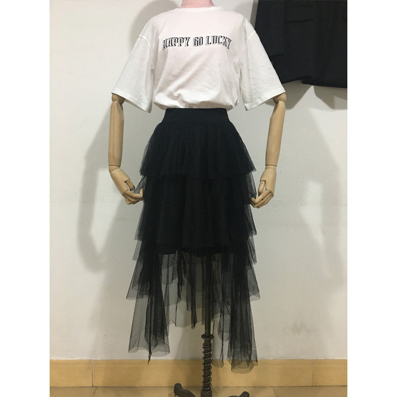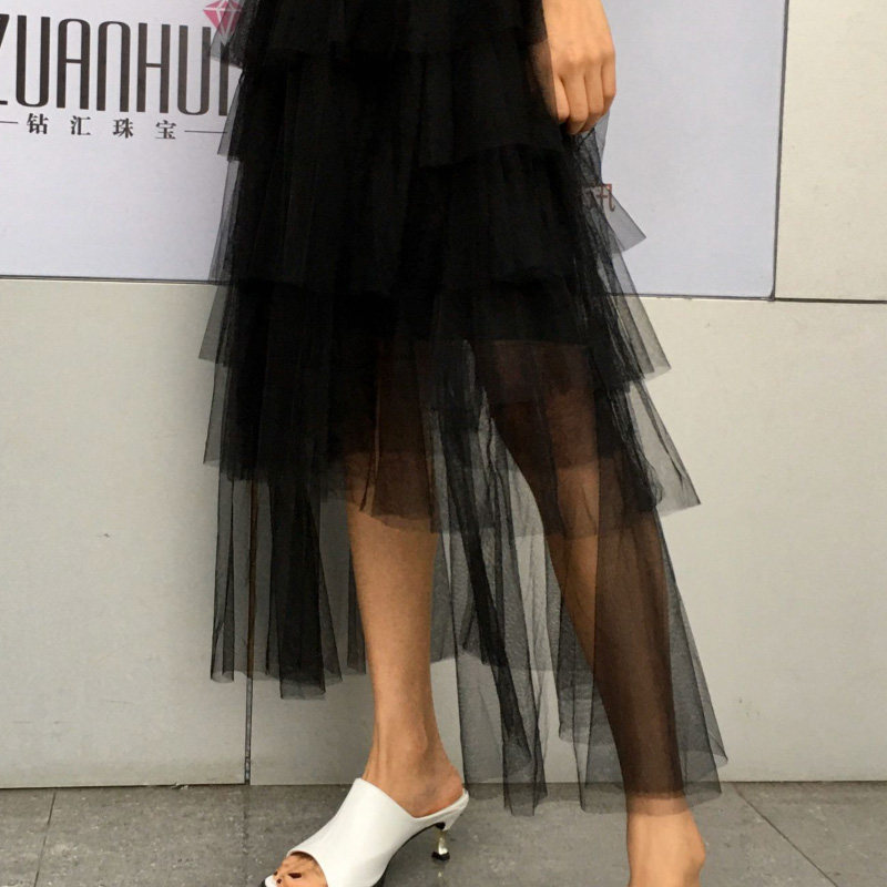 2020 new women's loose elastic waist mid-length skirt summer black fashion short front and back long mesh skirt