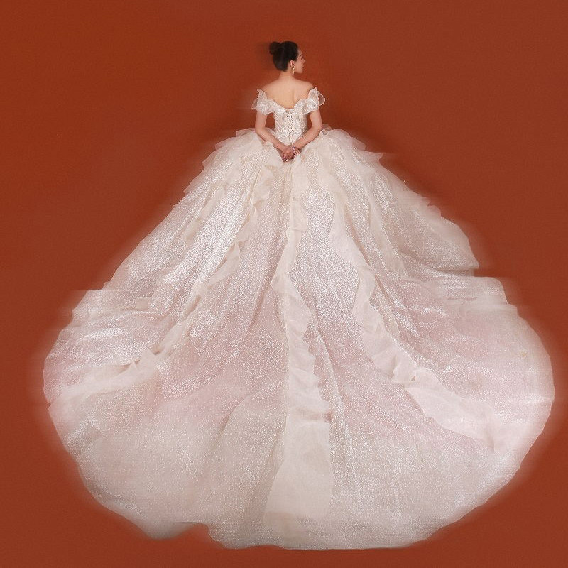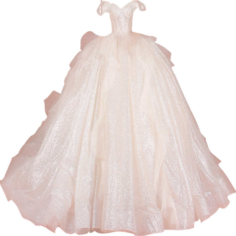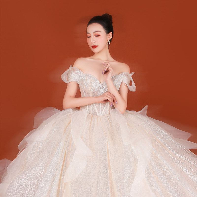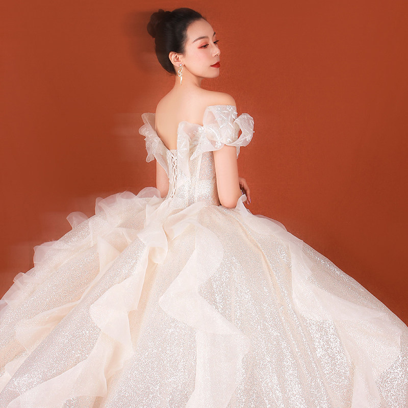 One-shoulder 2022 new bride French starry sky main wedding dress fairy princess dress simple heavy industry luxury small man