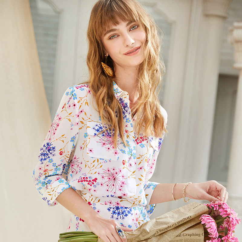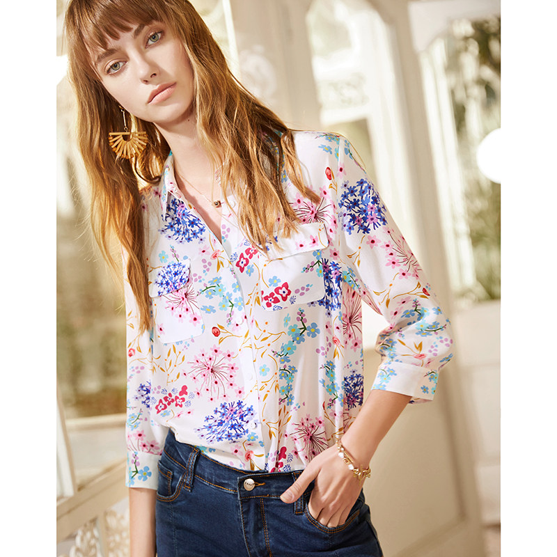 U N Q Blossoming Romantic Aesthetic Digital Printing Pure Mulberry Silk Loose Classic Silk Shirt Top Women