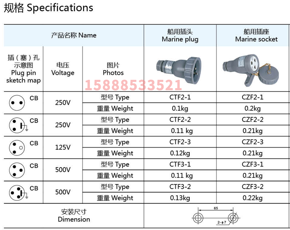 2-hole plug and socket CTF2-1 CZF2-1 250V3-hole plug and socket CTF2-2 CZF2-2 250V2-hole plug and socket CTF2-3