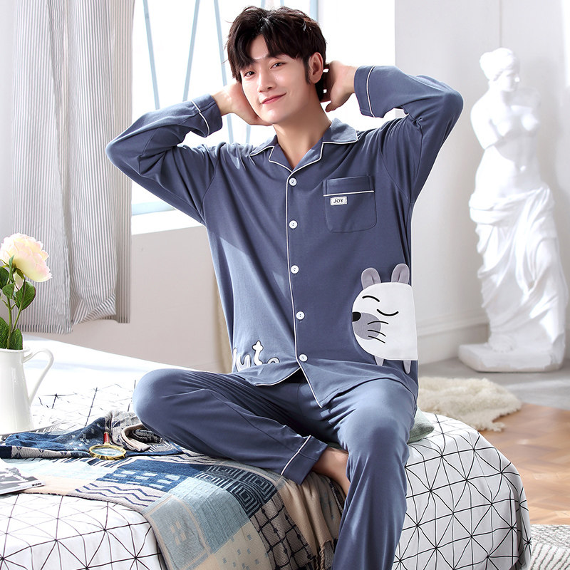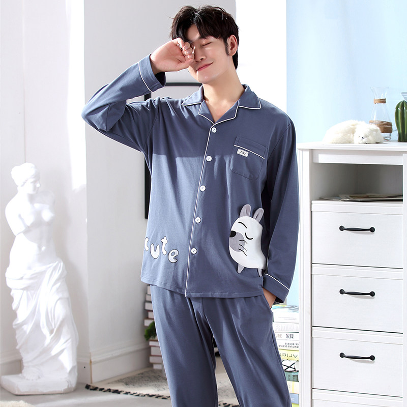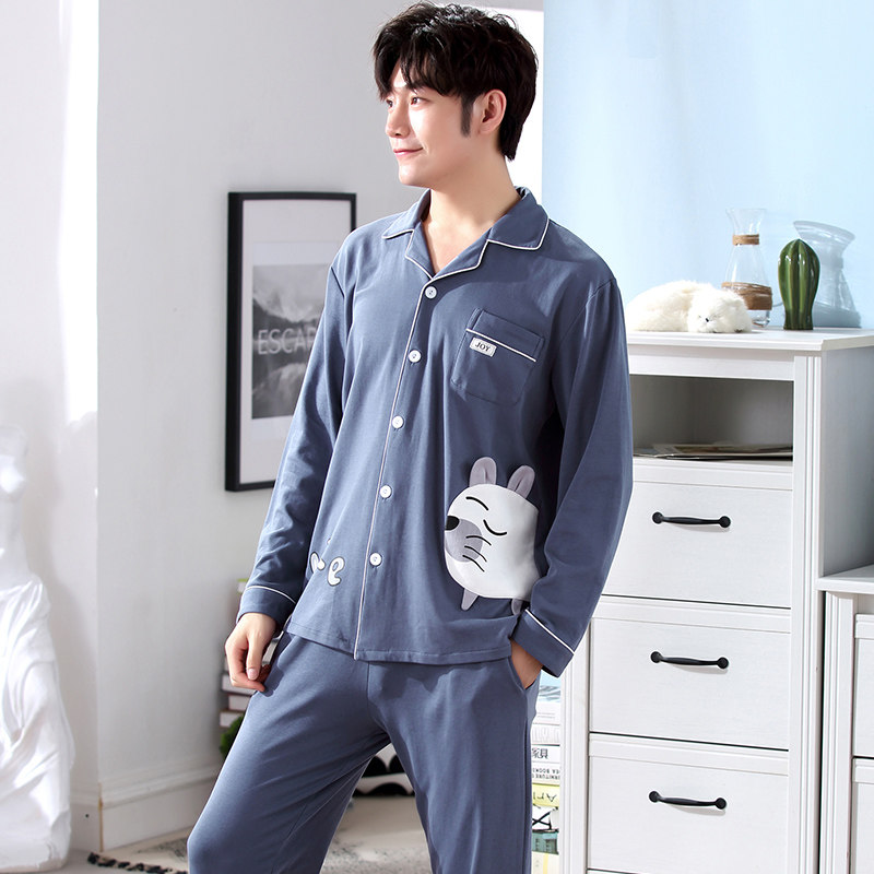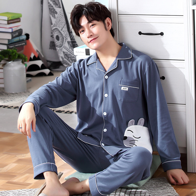 Pajamas men's cotton long-sleeved cardigan home clothes Korean version cotton loose men's youth student leisure suit spring and autumn