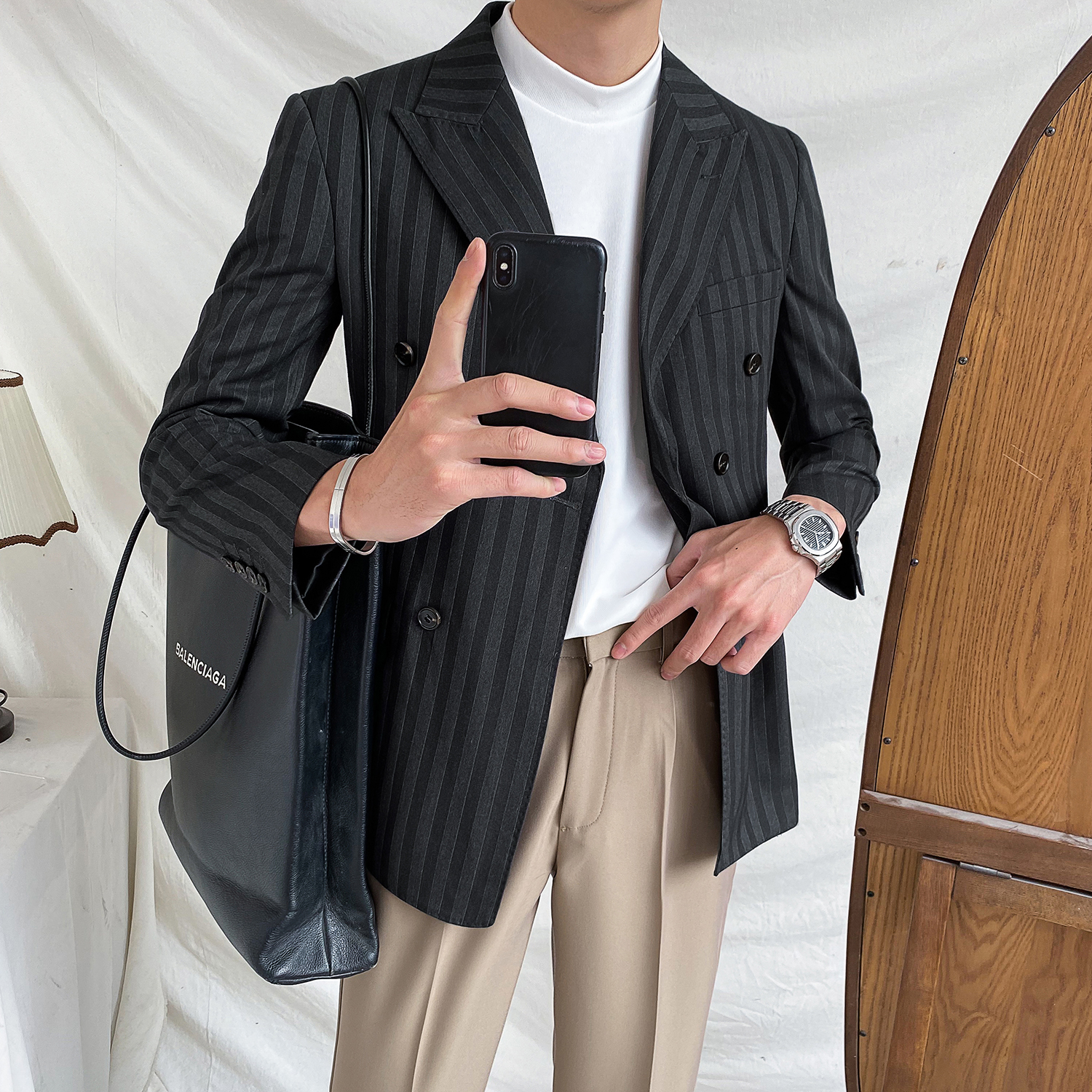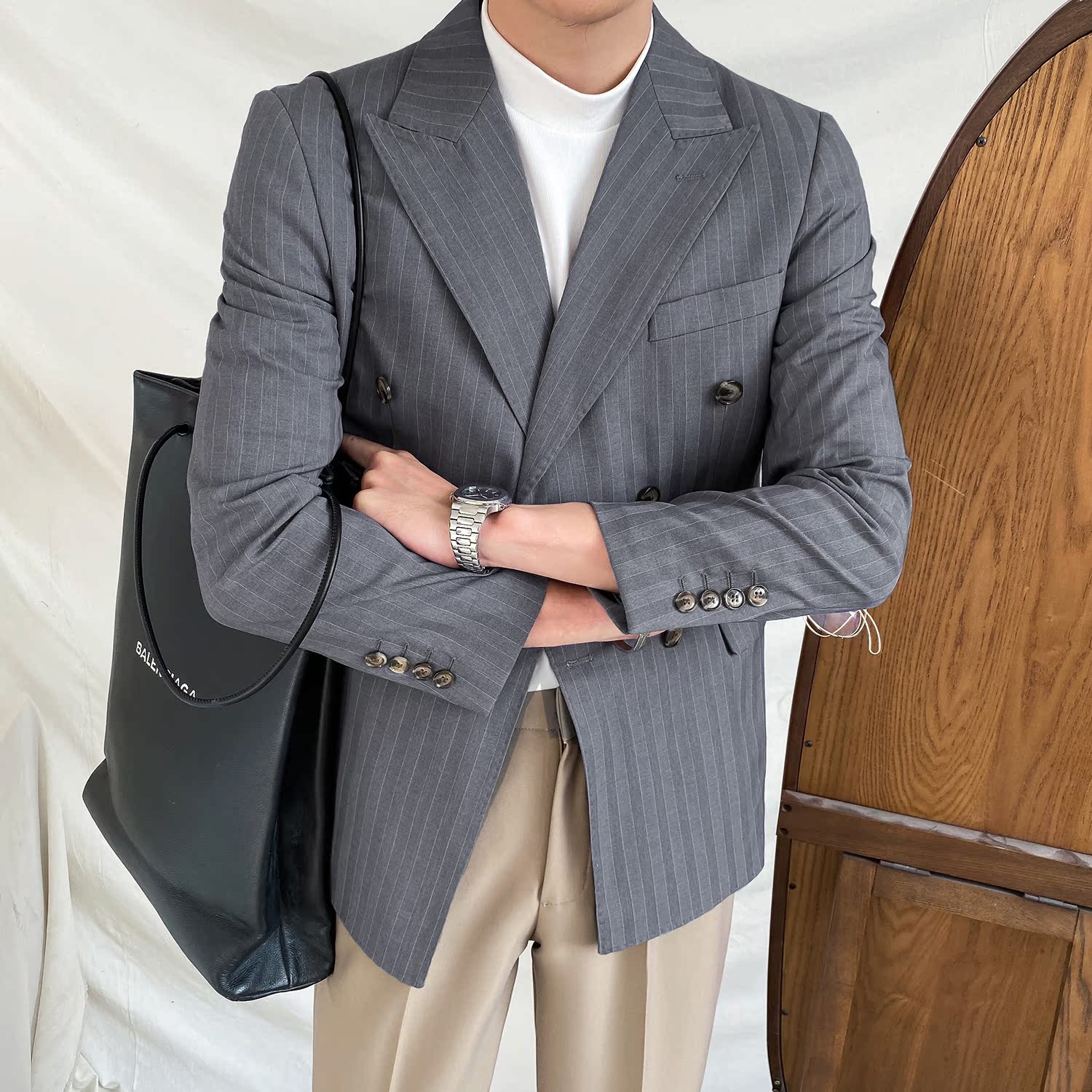 Men's stripes double-row button suit business leisure Han edition of the trend of handsome English little suit coat