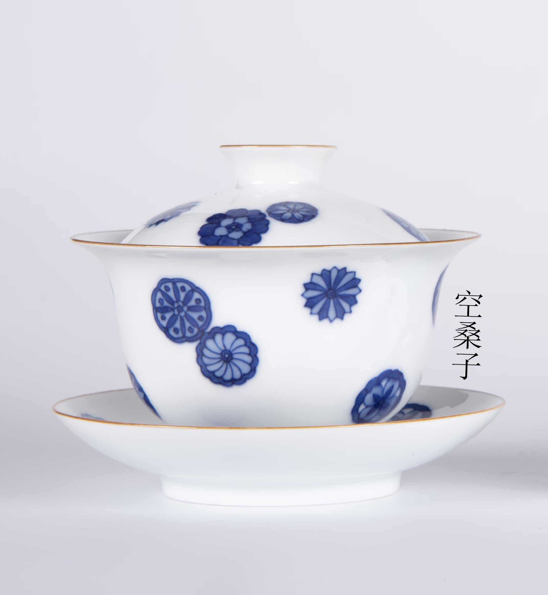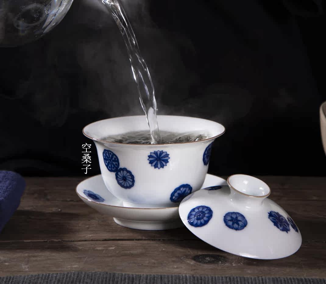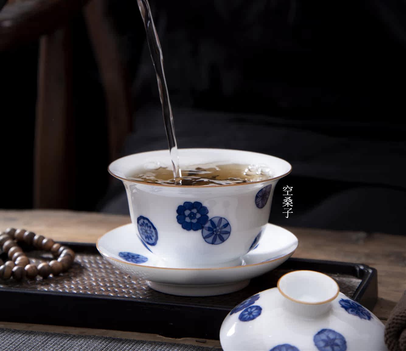 Underglaze blue and white leather ball flower three talent cover bowl pure handmade thin tire round melting cover bowl ceramic kung fu tea set