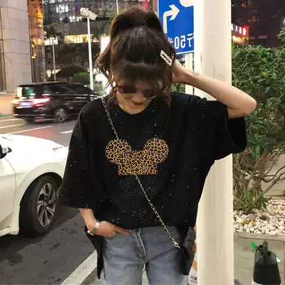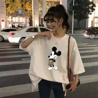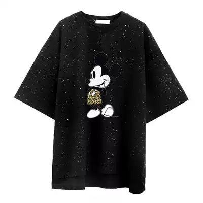 Mickey Mouse medium and long short sleeve t-shirt women fat mm loose thin sparkling sequins covering belly 300 Jin large size women's clothing