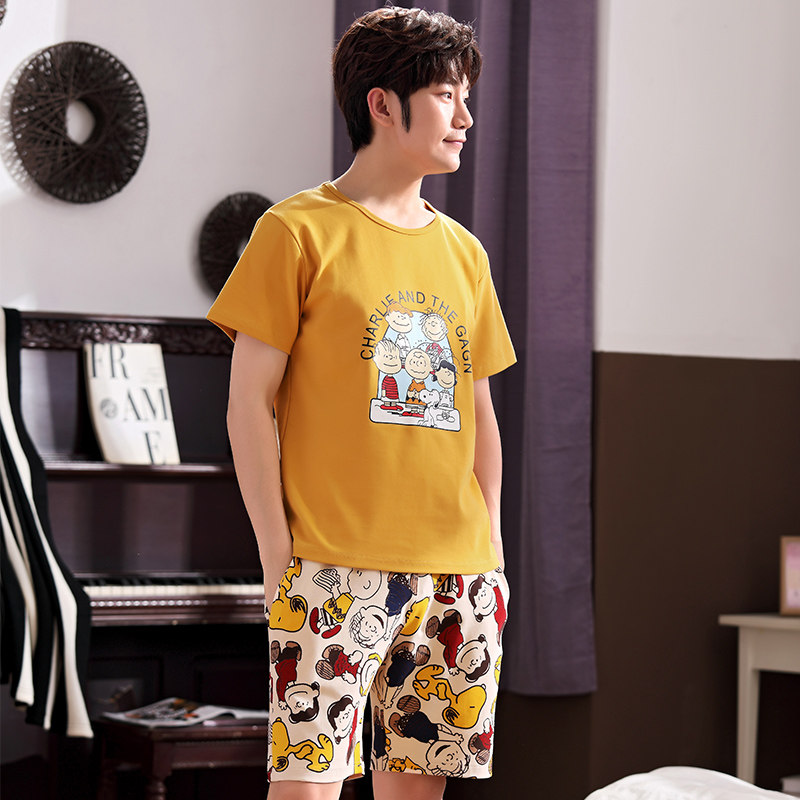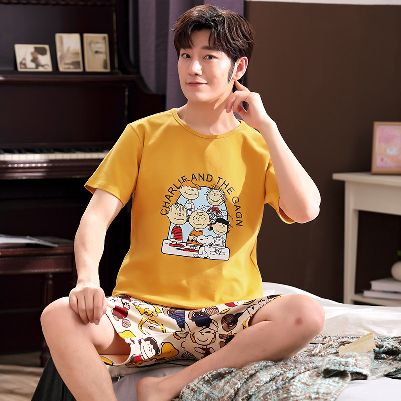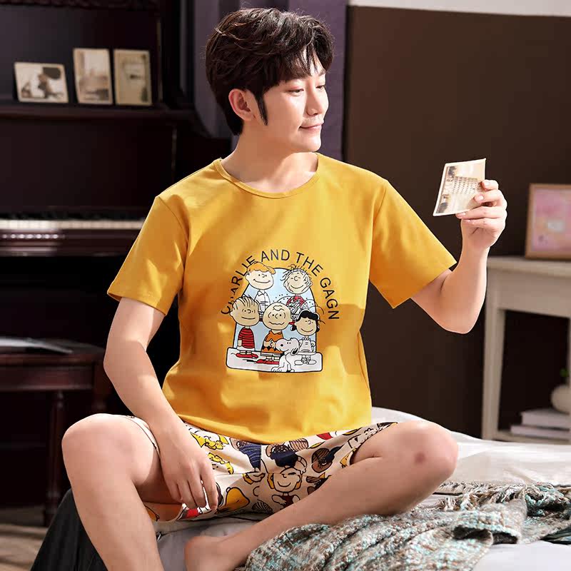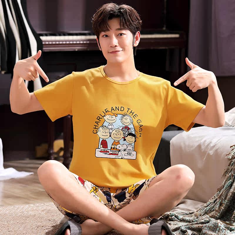 Pajamas men summer pure cotton short-sleeved suit cute cartoon primary and secondary school students teen boys large size home clothes summer
