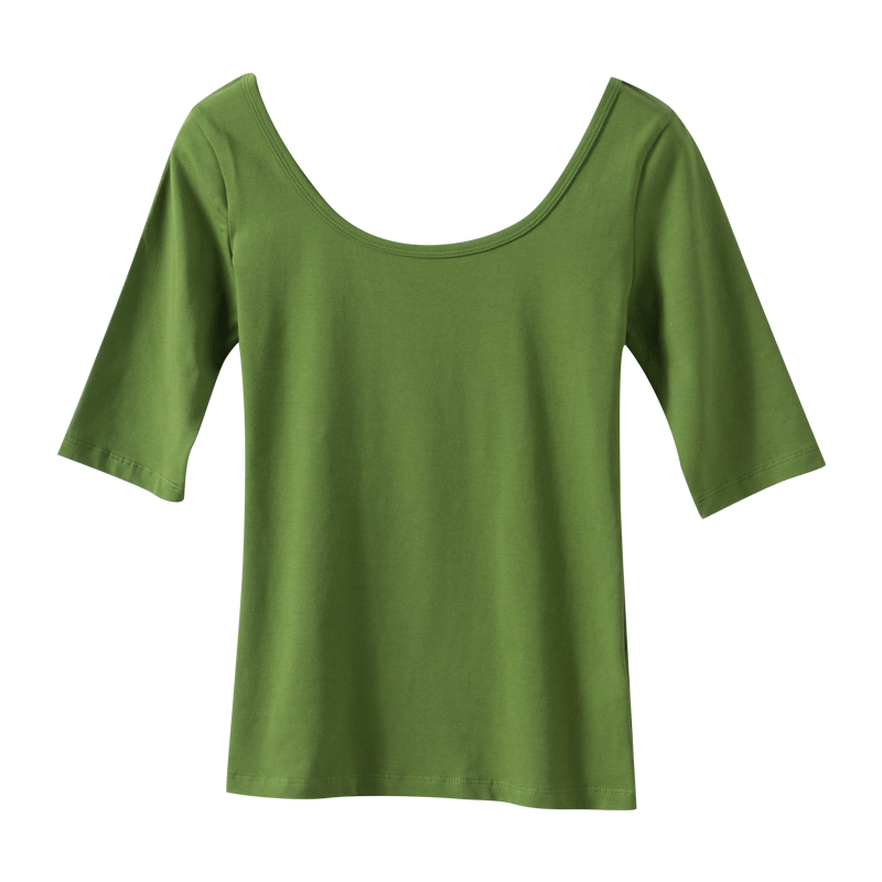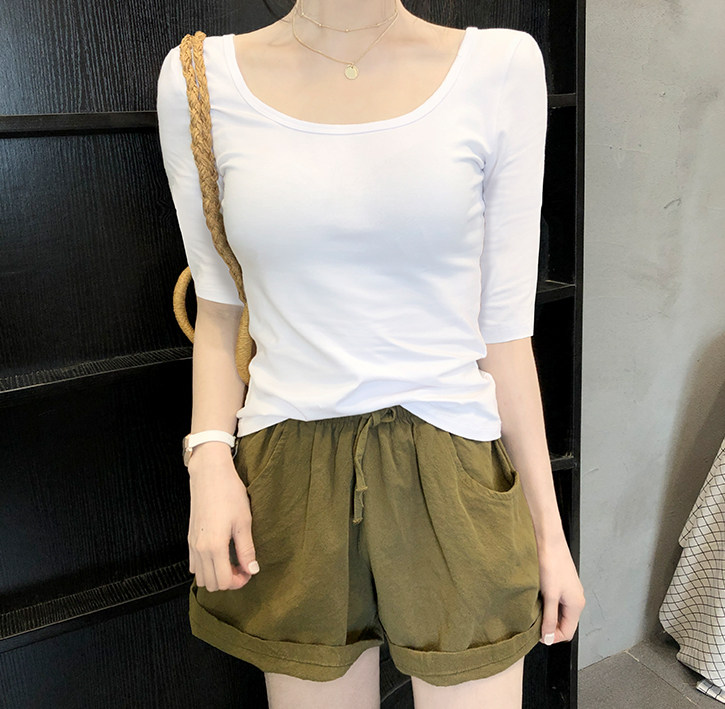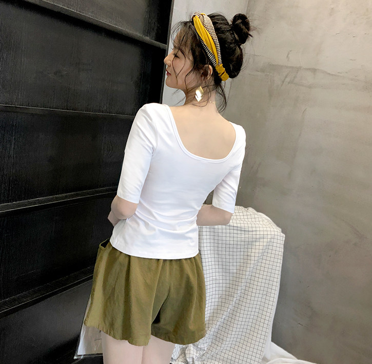 Middle Sleeve White T-Shirt Woman Low Collar Tight Jacket U Collar Pure Cotton Inner Lap Coat Large Neckline Spring Autumn Dew Back 50% Cuff Tide