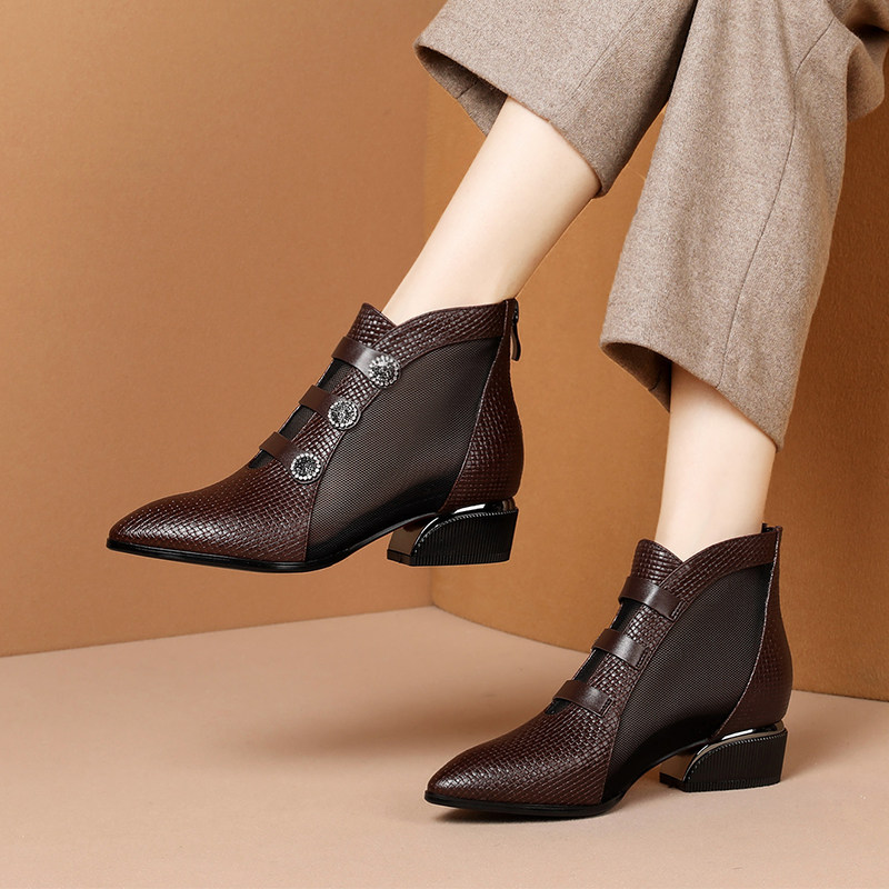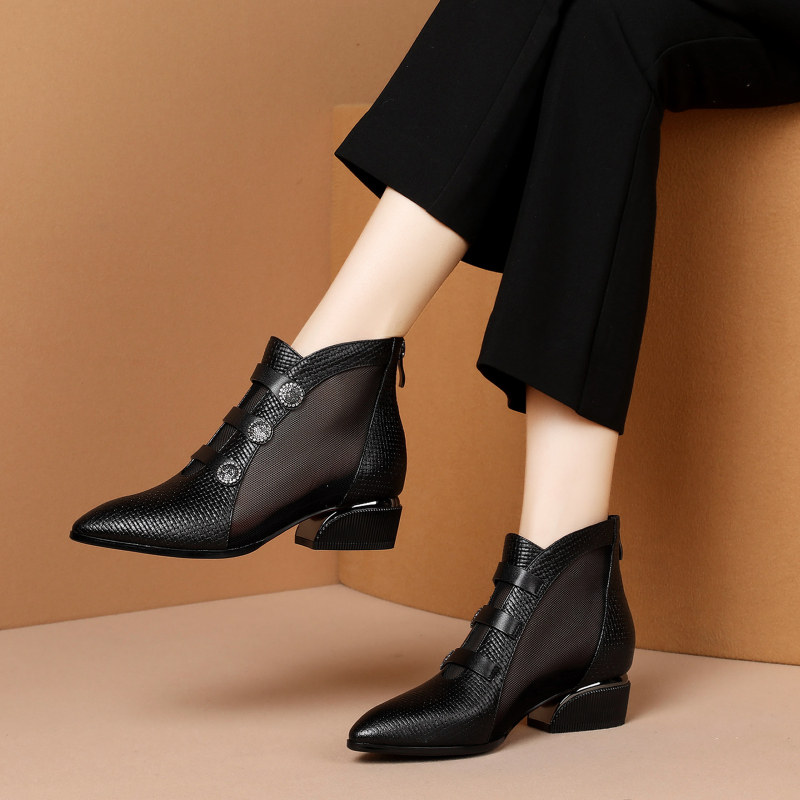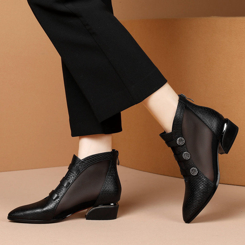 Leather thick heel sandals 2022 spring and summer new hollow mesh boots large size mesh sandals women's medium heel pointed toe England