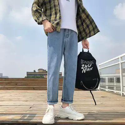 Light blue wide-leg loose jeans men's summer nine-point casual pants trend Korean straight thin long pants
