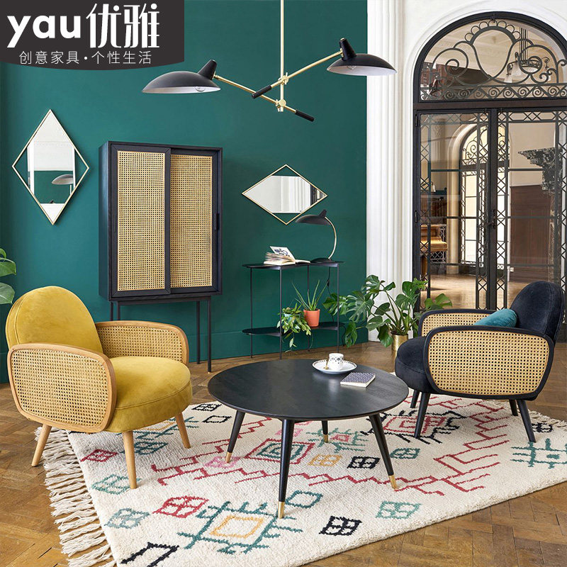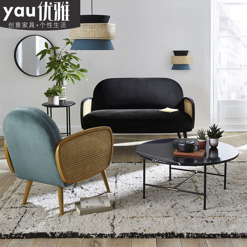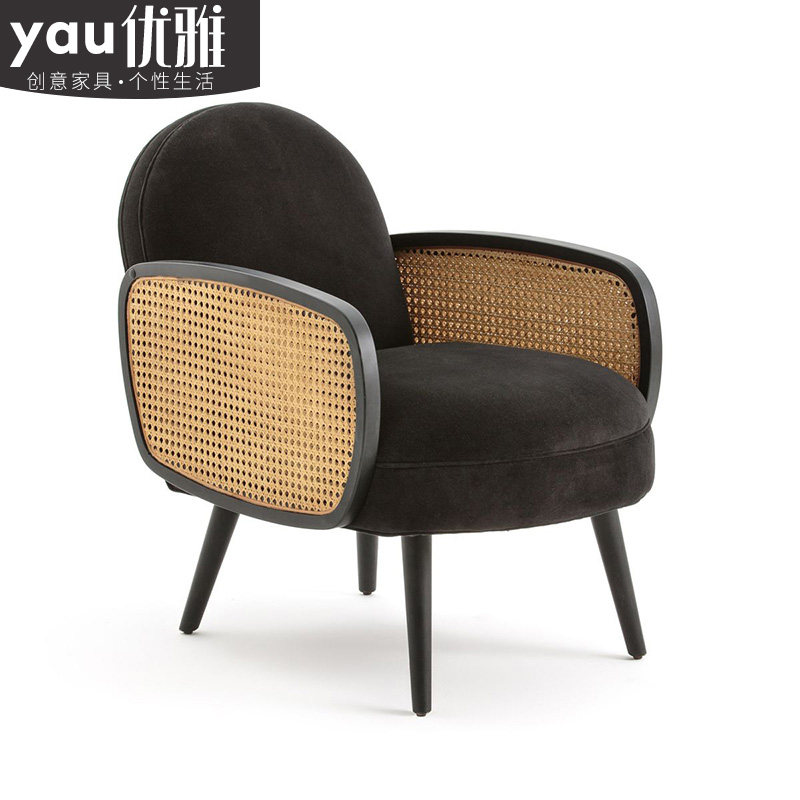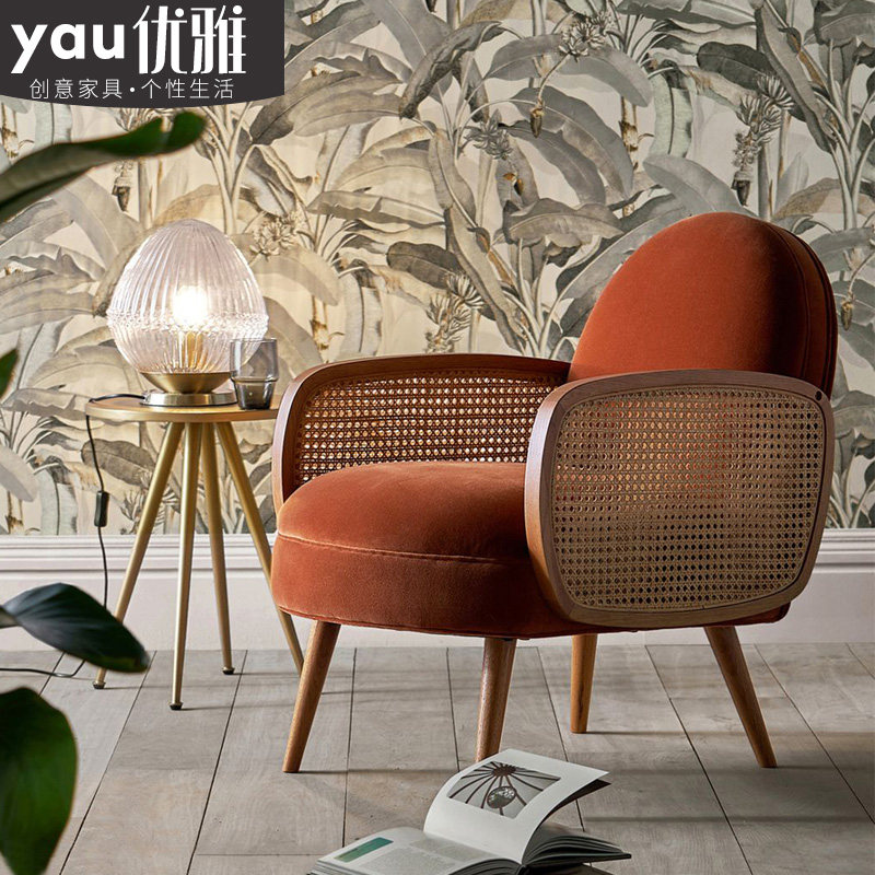Nordic fabric light luxury single sofa chair small apartment solid wood rattan living room armrest retro light luxury net red style
