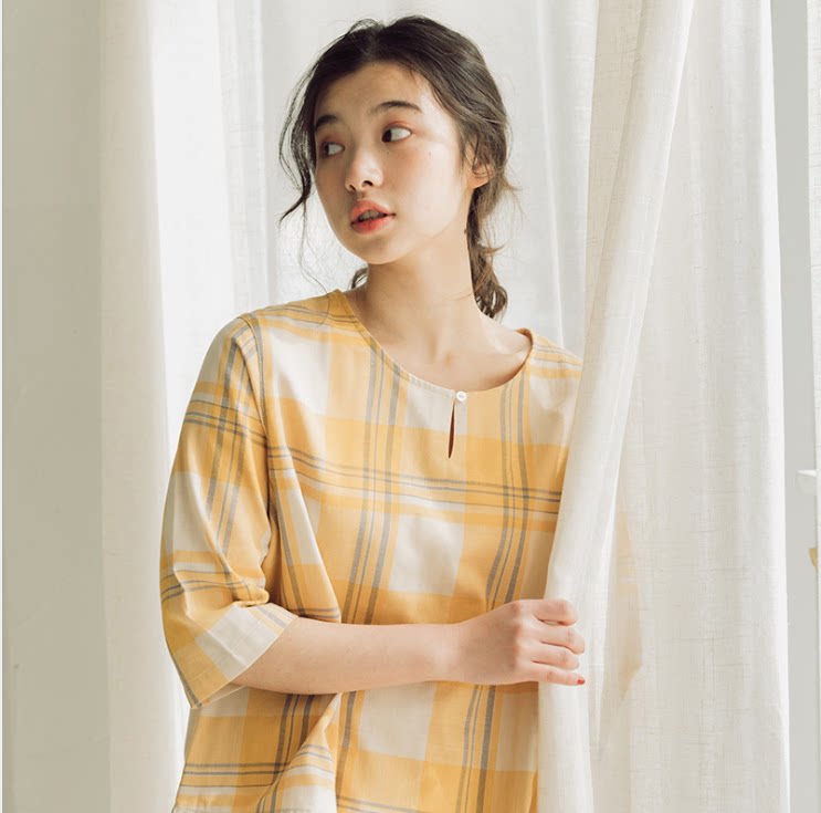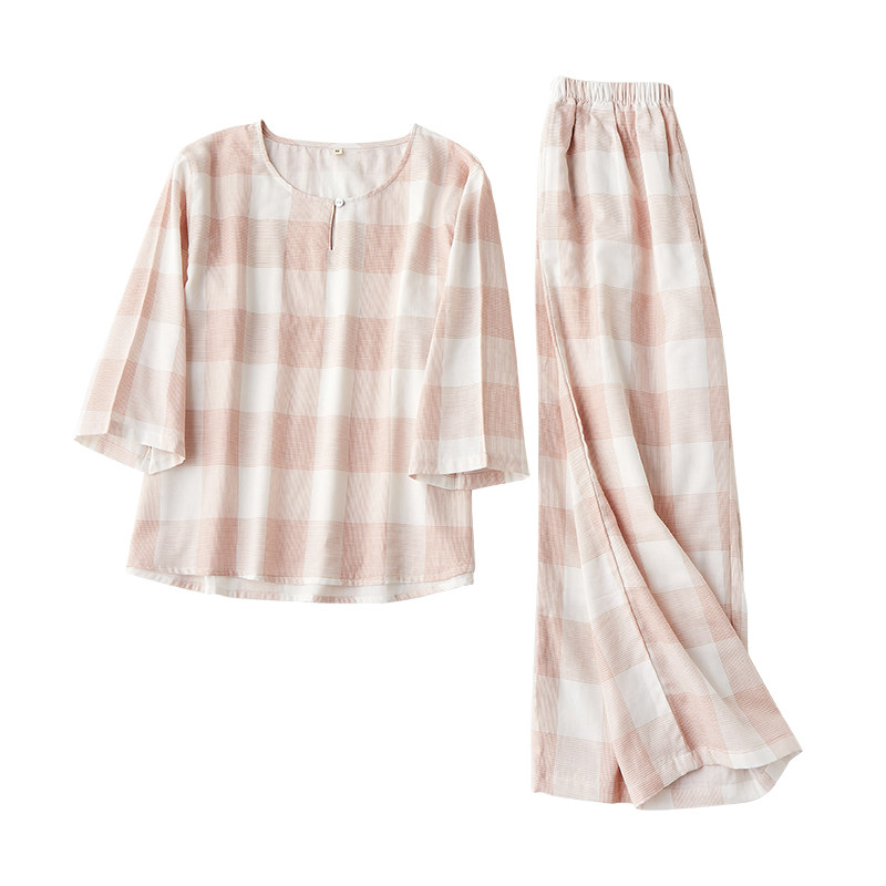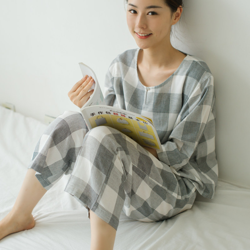 Thin pullover pajamas ladies cotton round neck suit spring and summer cotton gauze plaid loose large size home wear