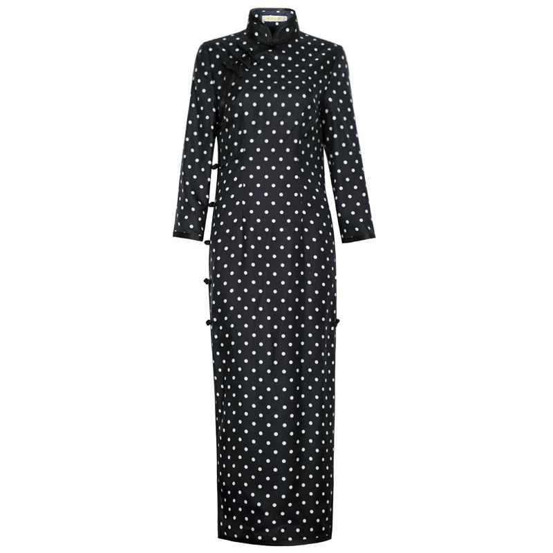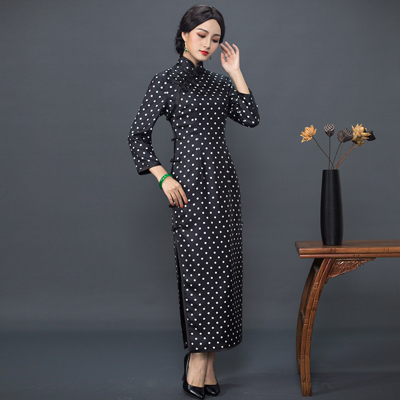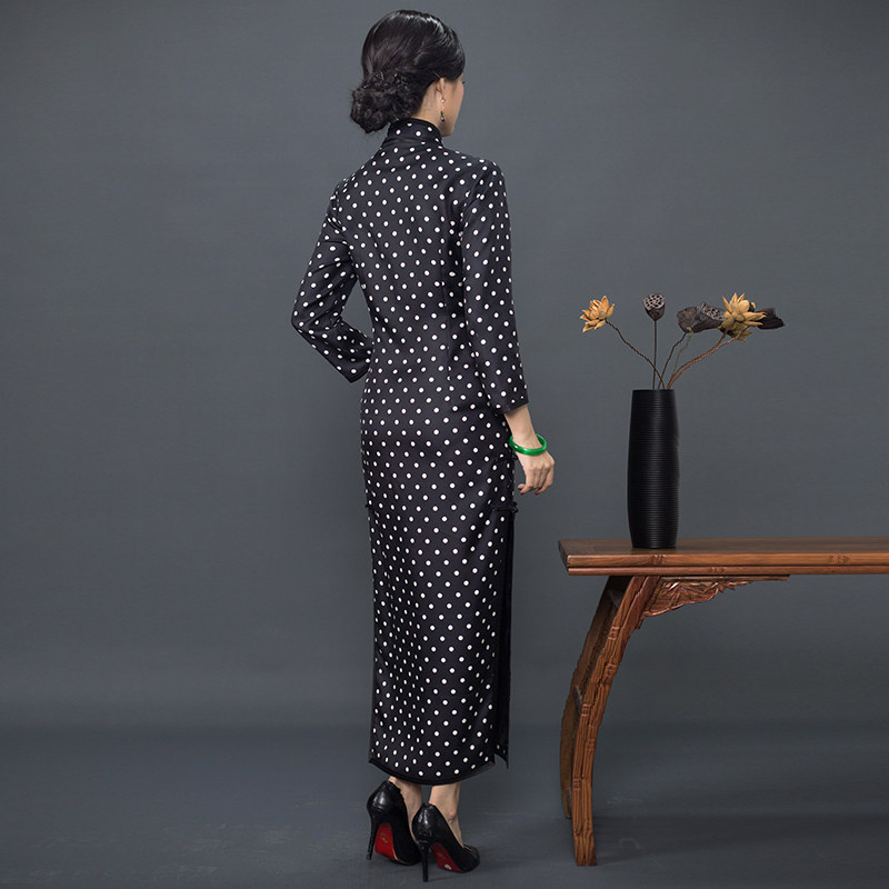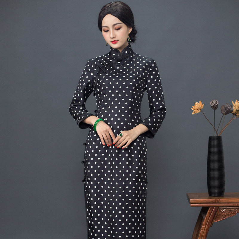 Chinese Classic 2021 Spring Chinese Style Retro Republic Style Slim Daily Polka Dot Twill Silk Cheongsam Long Section Women