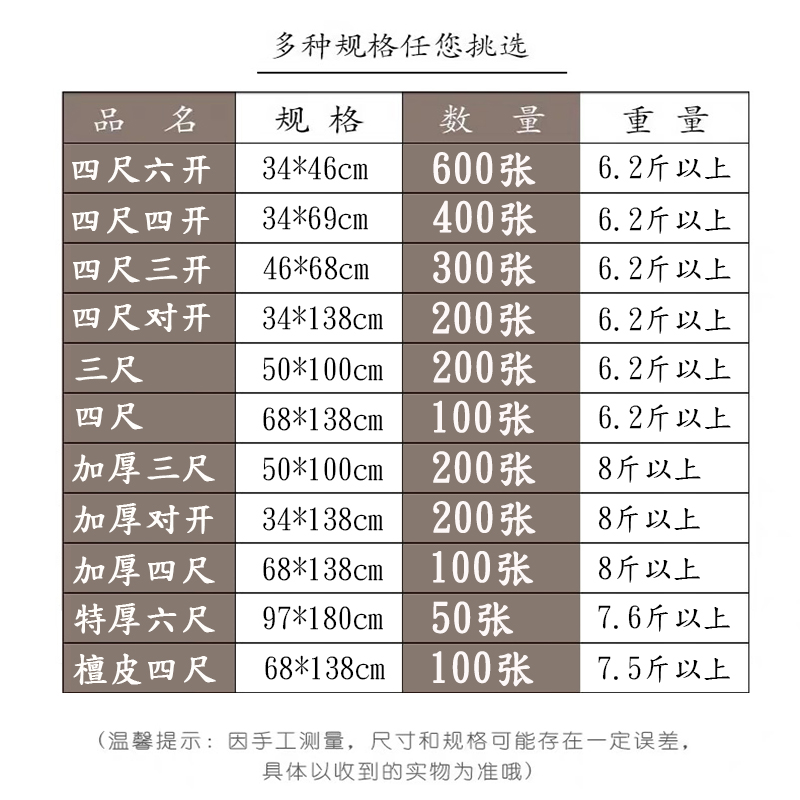 4 feet 6 open 34*46cm (600 photos) 4 feet 44*68cm (400 photos) 4 feet 3 open 46*68cm (300 photos) 4 feet apart 34*138cm (200 photos) 3 feet 50*100cm (200 photos) 4 feet 68*138cm (100 photos) 4 feet creation rice paper (10 sheets) Thickened 3 feet 50*100cm (100 photos) Thickened three-foot 46*68cm (300 photos) Thickened four feet folio 35*138cm ( 100 photos) Thickened four feet 69* 138cm (100 photos) Thickened six feet 97* 180cm (50 photos) Sandalwood creation shengxuan four feet (100 photos) Thickened eight feet (50 sheets 16 pounds or more) Thickened small six feet (50 sheets 5.5 kg or more) Thickened 1 zhang 2 (25 pieces) Thickened four feet hemp Xuan 9 kg 100 pieces 4 feet eight open 38 yuan (600 pieces)