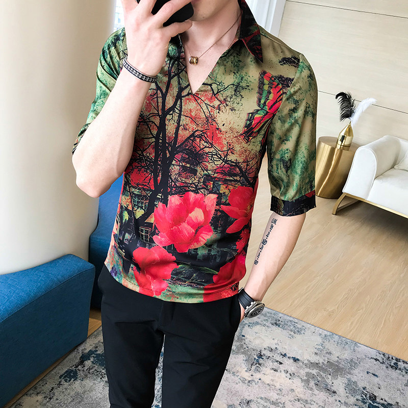 ins shirt male 70% sleeve blouse fashion printed V collar short sleeve snow-spinning shirt 2022 spring and summer slim fit T-shirt