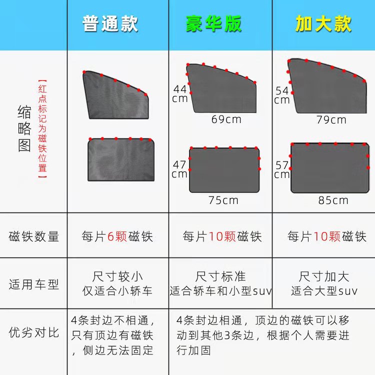(Ordinary style)Front window black 2 pieces (Ordinary style)Rear window black 2 pieces Suction cup aluminum film front gear(130*60) Suction cup mesh rear gear (upgrade plus style)2 pieces before and after each front and rear front gear (130 * 60) Suction cup mesh rear gear (upgrade plus style) 2 pieces before and after each front and rear front gear (130 * 60) Suction cup mesh rear gear