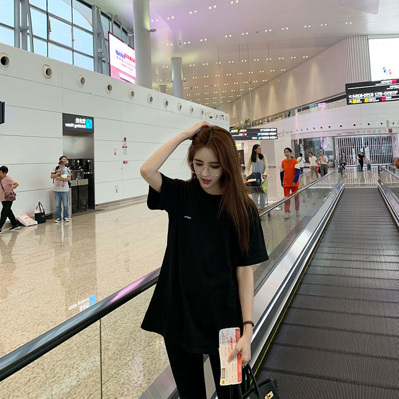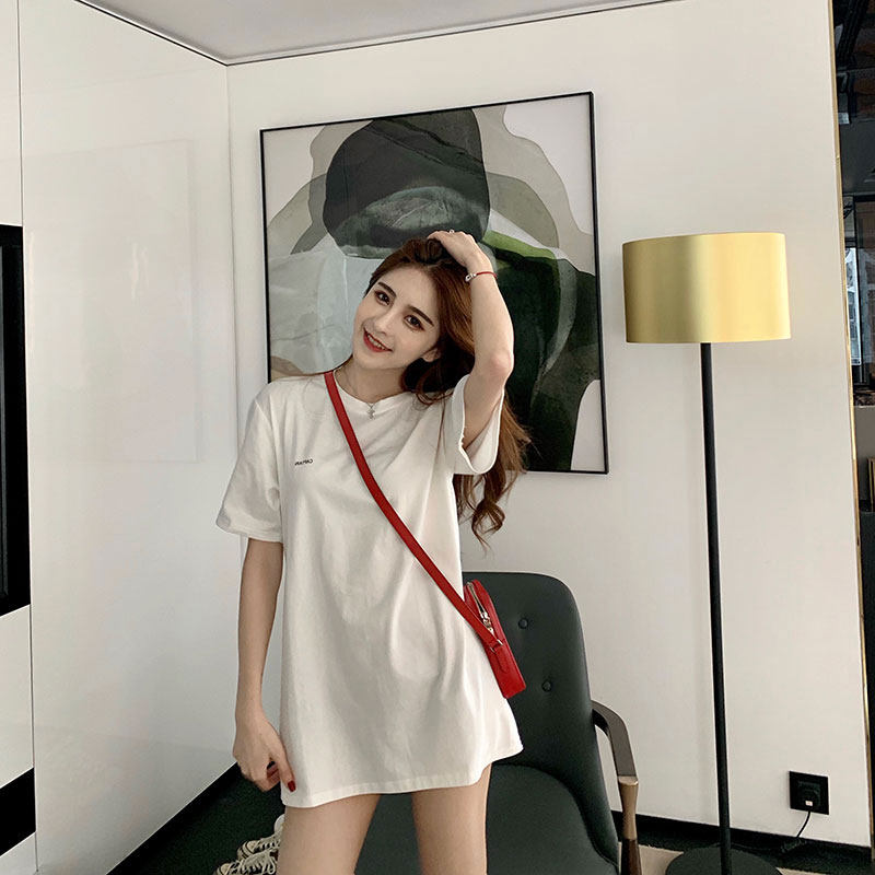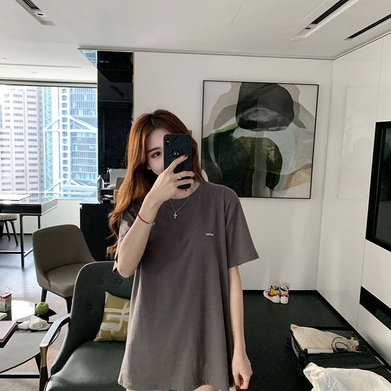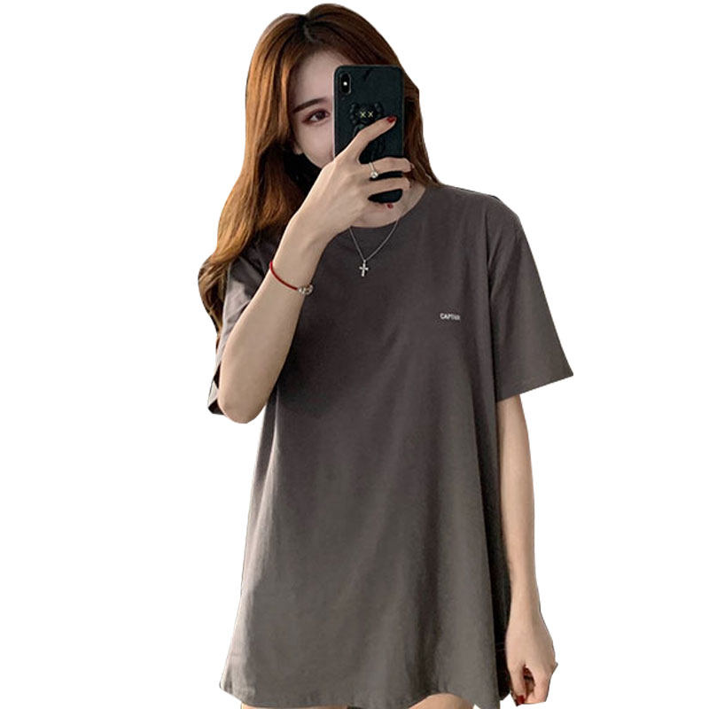 Western style casual solid color short-sleeved t-shirt women's loose Korean version 2022 summer new trendy mid-length bottoming top