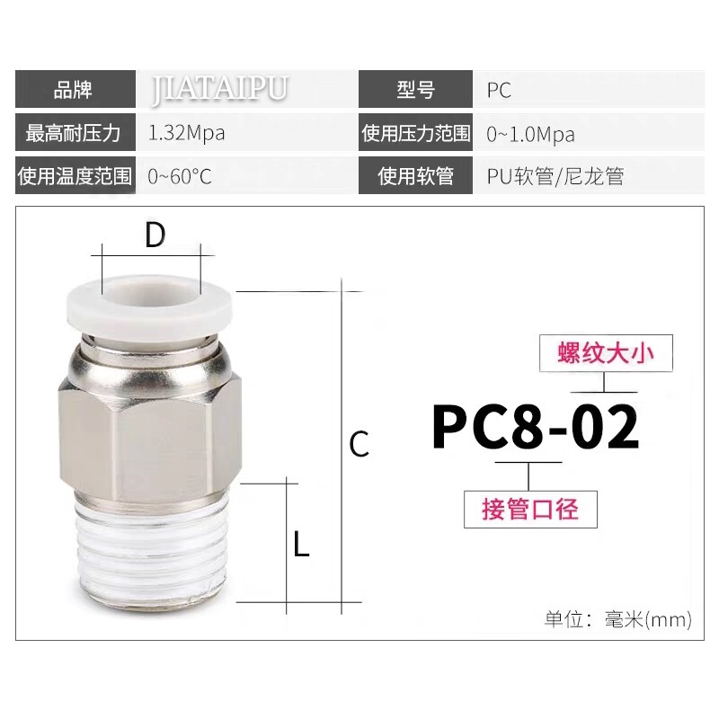 Pneumatic joint copper rapid joint thread through PC series air pipe fast plug high-end joint copper nickel plated antioxidant