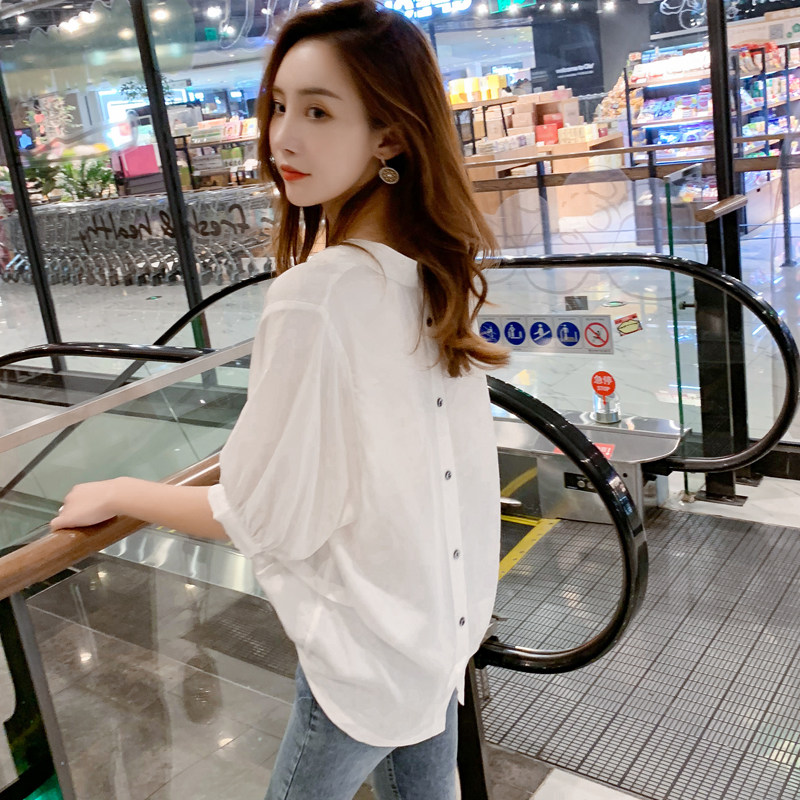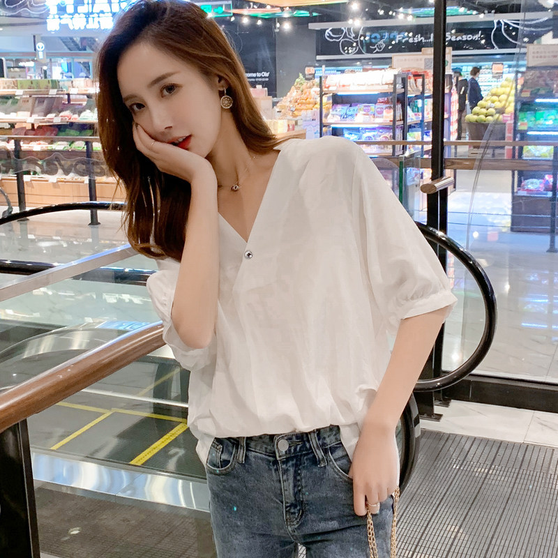 Summer clothing Korean version casual female short sleeve shirt V collar loose shirt lantern sleeve blouse 100 hitch hooded sweatshirt Han Fan