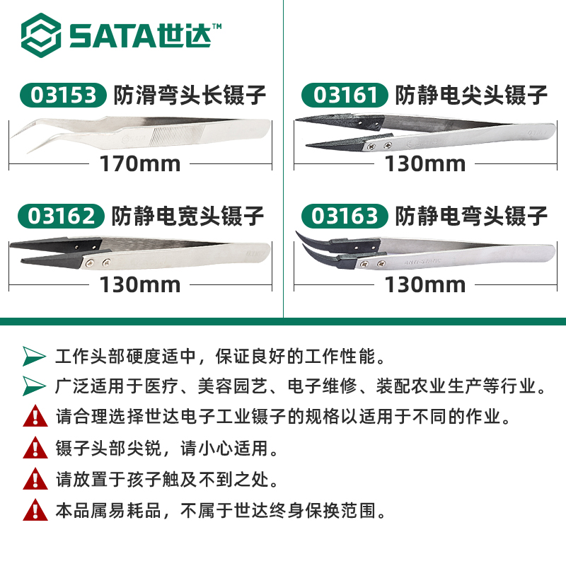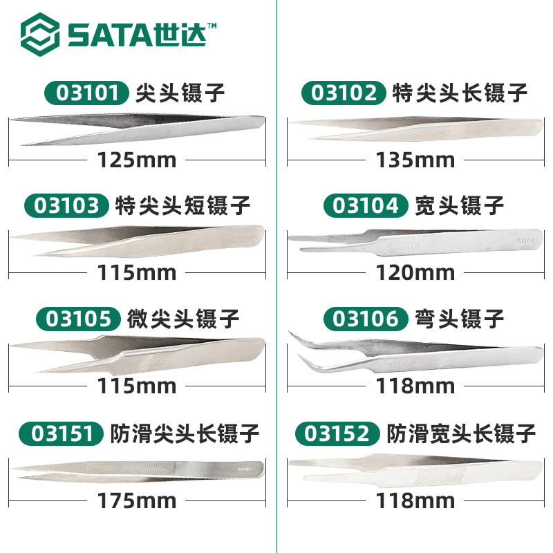 03101 pointed tweezers 125mm 03102 Ttip length tweezers 135mm 03103 Ttip short tweezers 115mm 03104 wide head
