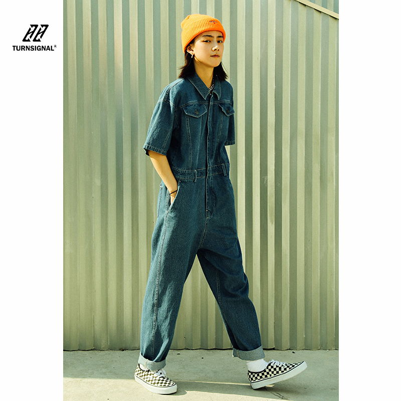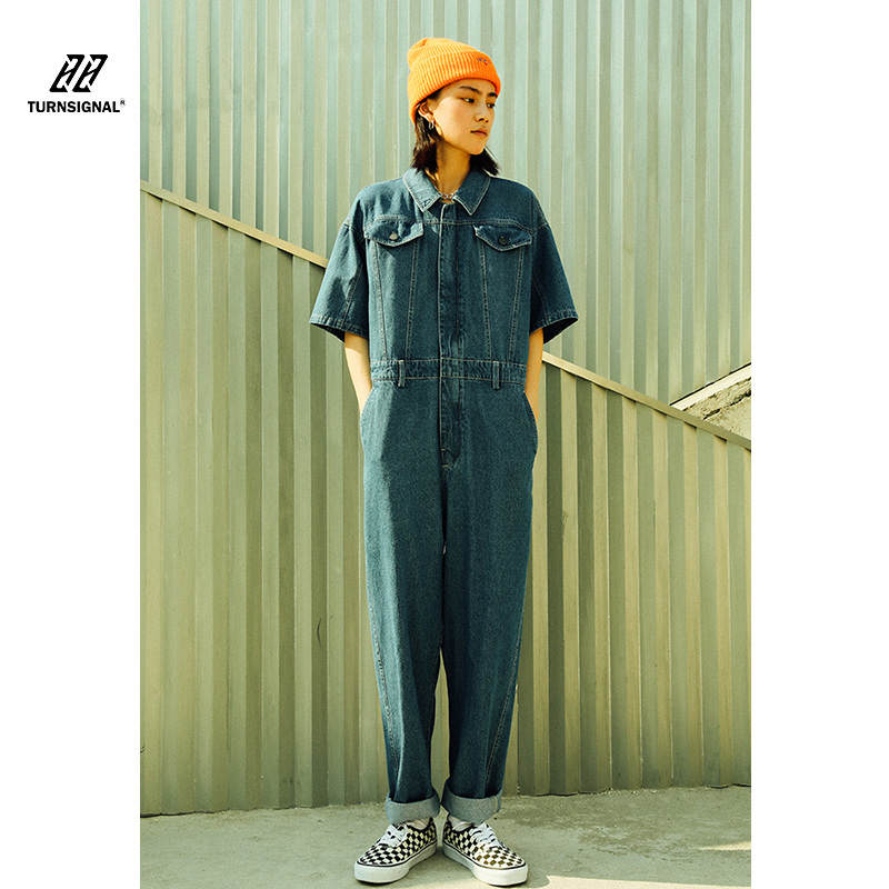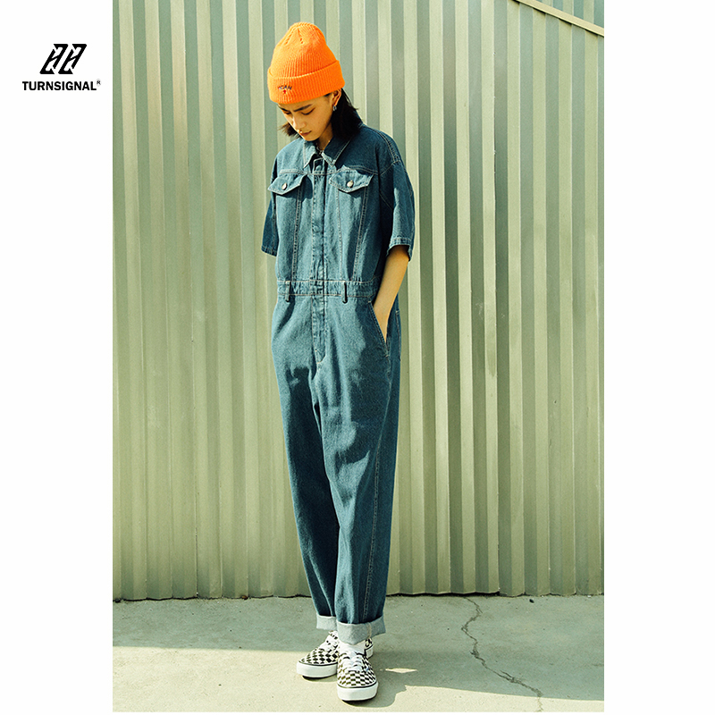 TURN signal 2021 new short-sleeved denim jumpsuit women's summer thin item pop brand tooling jumpsuit pants