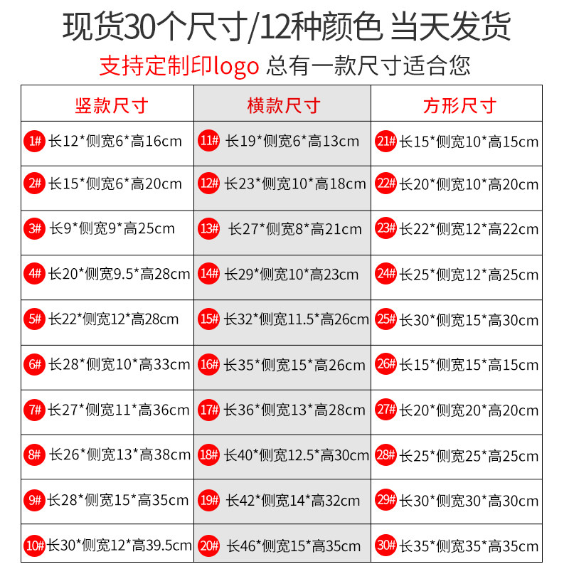 No. 1 Vertical Length 12 Side Width 6 Height 16cm2 Vertical Length 15 Side Width 6 Height 20cm3 Vertical Length 9 Side Width 9 Height 25cm4 Vertical Length 20 Side Width 9