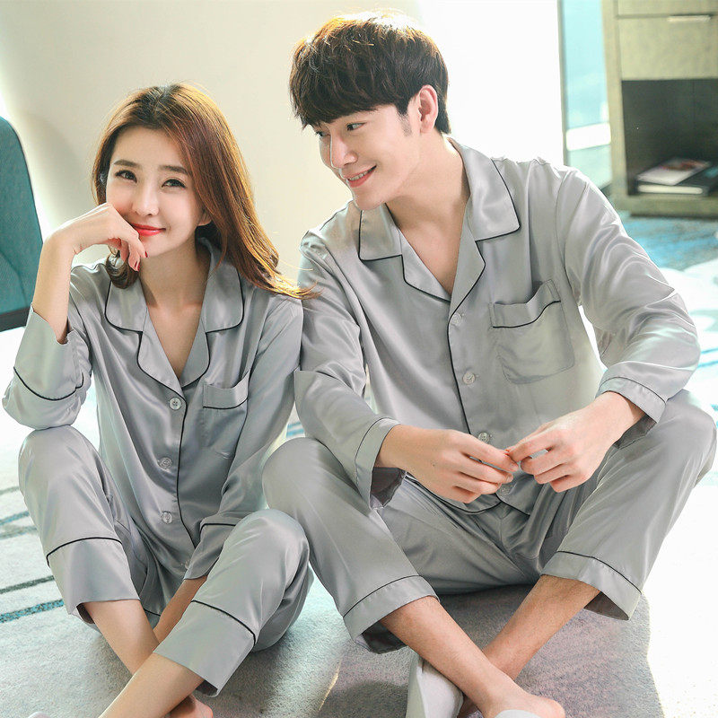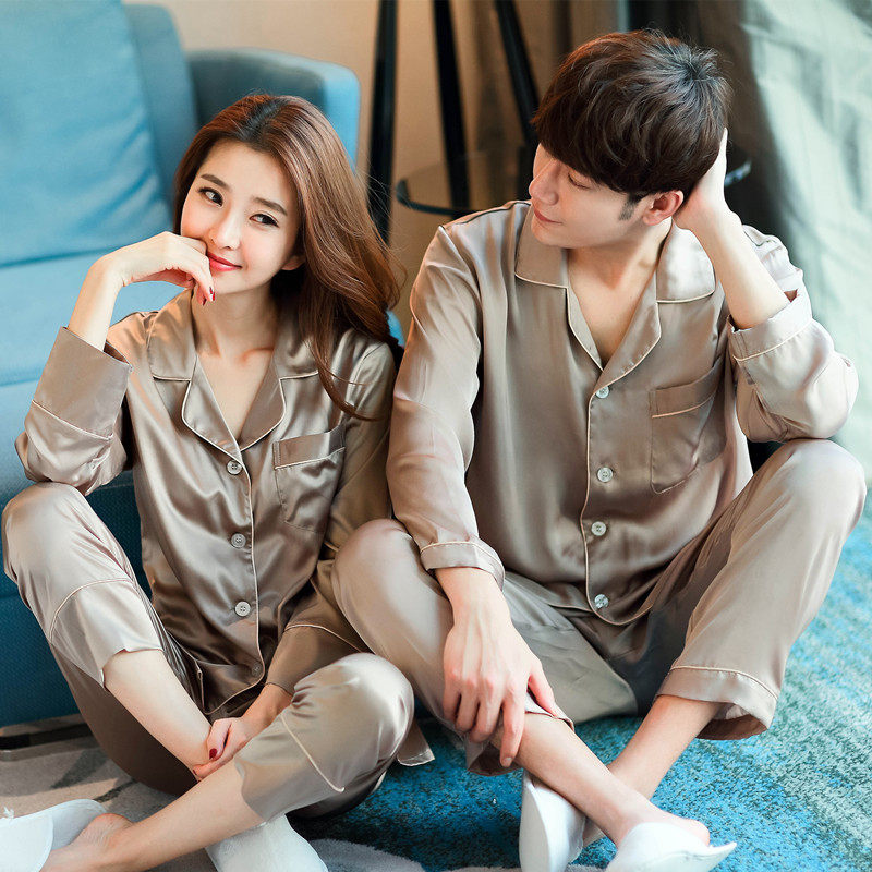 Spring and autumn couple silk pajamas women's 2020 new long-sleeved silk homewear suit men's ice silk thin summer