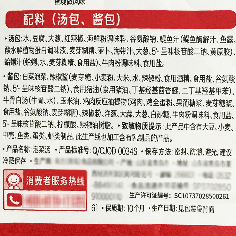Cabbage kimchi chili sauce (maltose wheat flour rice water paprika edible alcohol edible salt sodium glutamate 5-flavored disodium nucleotide) beef bone white soup (bovine bone water) edible lard (butyl hydroxyanisole edible lard dibutyl hydroxytoluene) corn oil chicken reaction pump