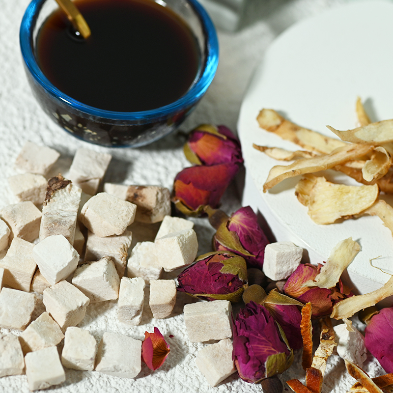 Poria Hawthorn Coix Seed Yam White Lentil Bean Mulberry Maltose Red Sugar Dried Orange Peel Retals Rose Lotus Leaf