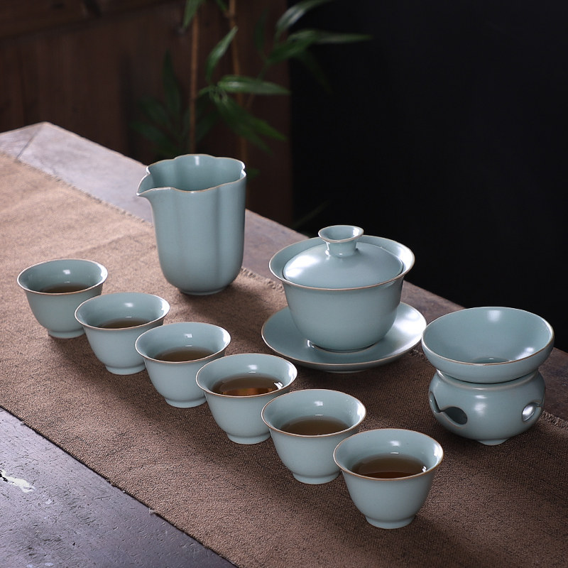Ru Kiln Kung Fu Tea Set For Home Suit Sky Green Ru Porcelain Open Sheet Retro Three Only Cover Bowl Teapot Tea Cup Gift Box Whole Set