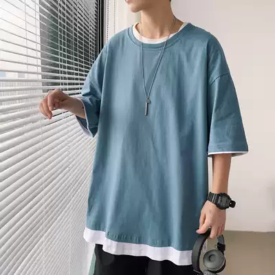 ins Hong Kong style fake two-piece short-sleeved men's t-shirt loose boys half-sleeved tide brand summer trend Harajuku style five-point sleeve tide