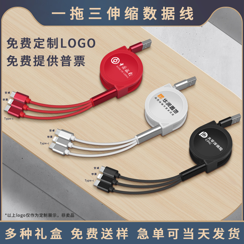 Data line Custom LOGO Dingmaking Printed Pattern Practical Advertising Small Gift Multifunction Telescopic One Tug Three Charging Line One Tug Three Extension Line Charging Wire Instrumental Glowing Wire Small Gift Custom Logo