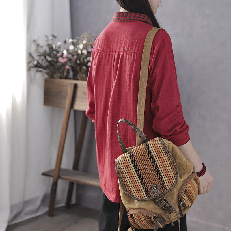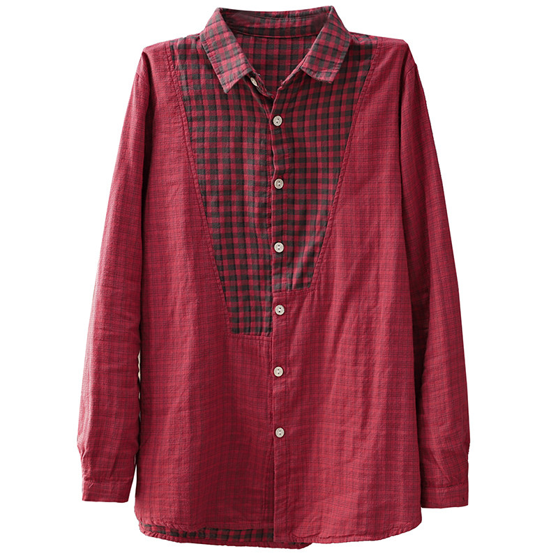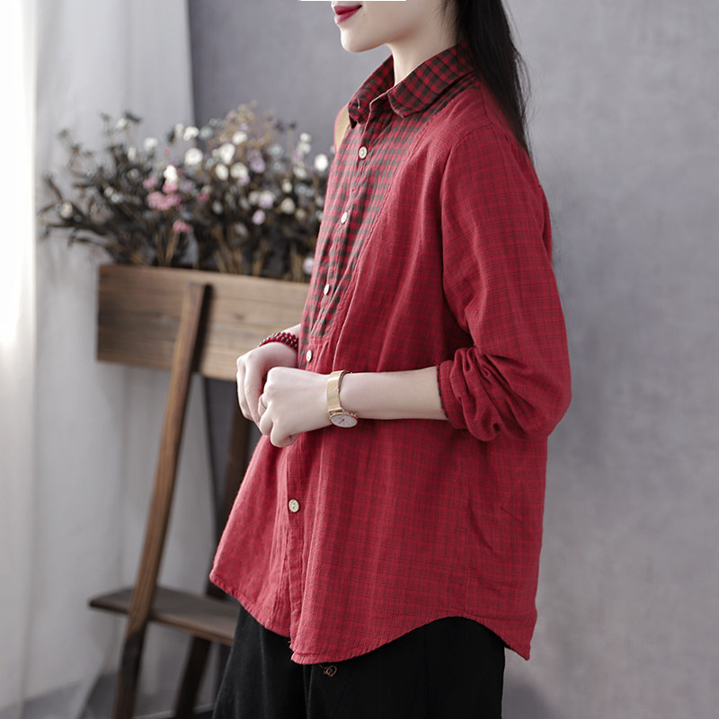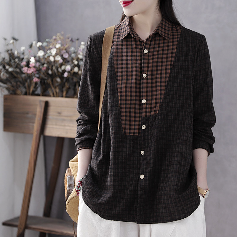 Han Suoyi retro literature and art spring and autumn new top base shirt cotton and linen plaid shirt women's long-sleeved Hong Kong taste thin
