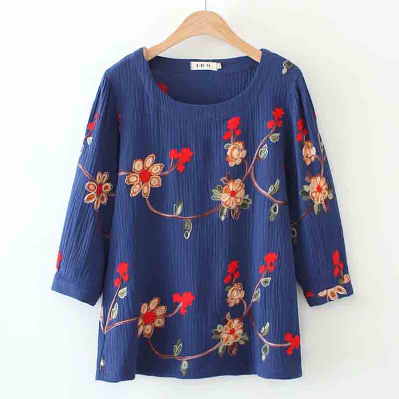 Middle Aged Spring Summer Dress New Gats up overweight Embroidered Flowers 70% Sleeves Cotton blouses middle-aged Mom T-shirt