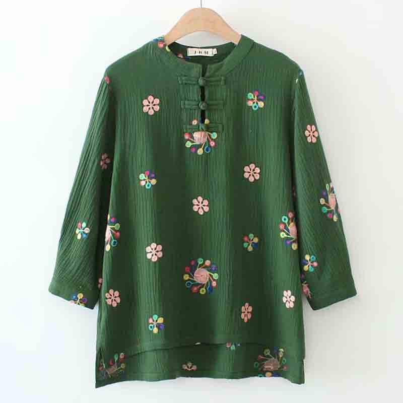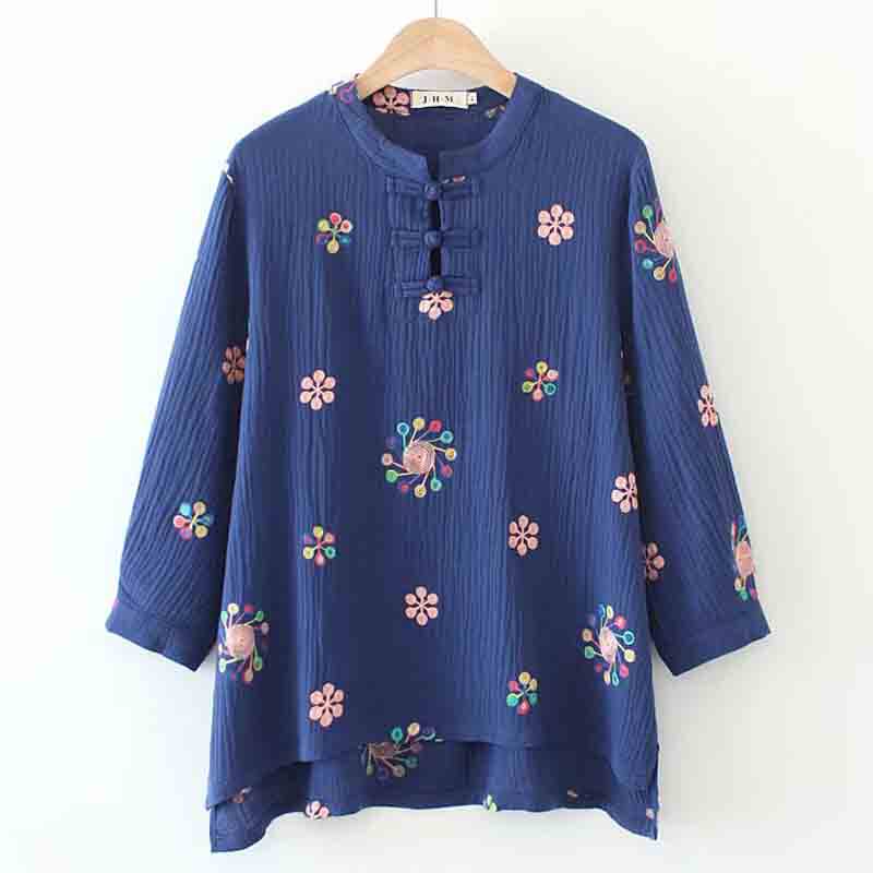 Middle-aged and elderly moms loaded with clothes in spring and summer clothes in long version of embroidery buckle disc cotton loose and reduced age foreign women's clothing T-shirts