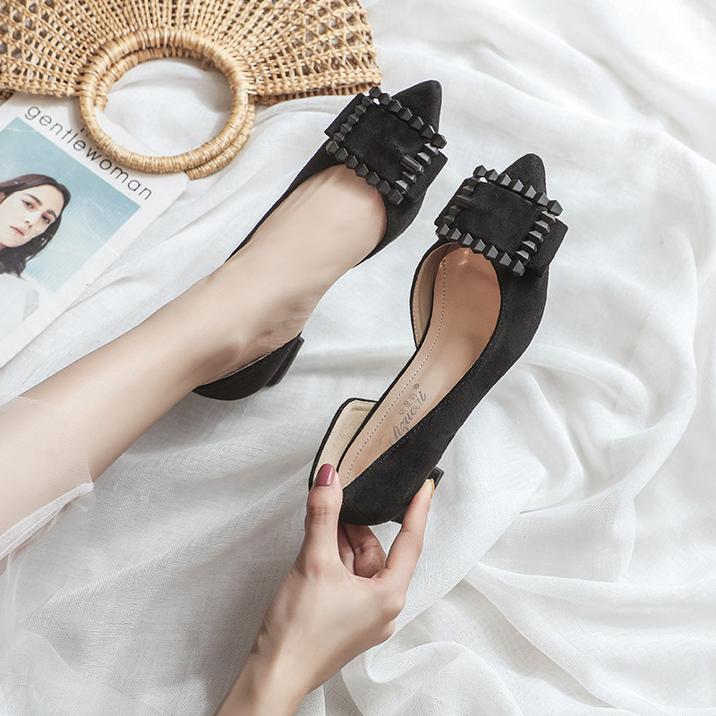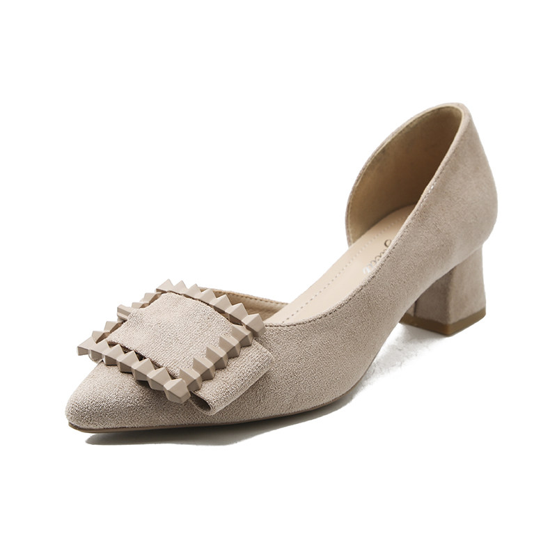 Single shoes women's 2022 spring new thick heel medium heel pointed toe spring and autumn 41 low heel 43 large size women's shoes nude high heels