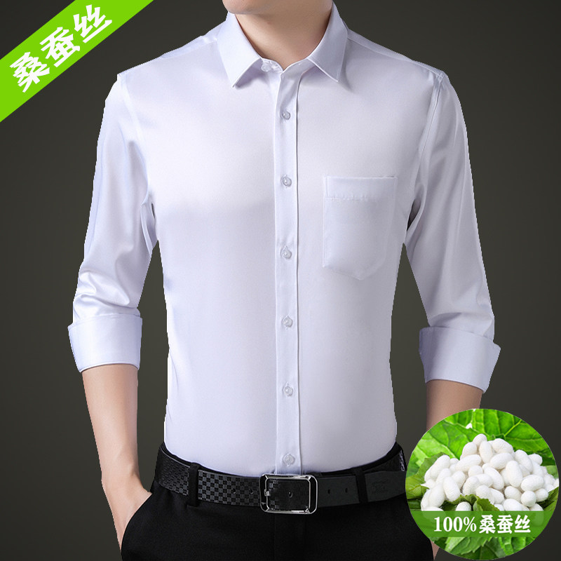 2020 winter mulberry silk long sleeve plus velvet shirt men real silk middle-aged business free of hot and casual men's clothing pure color lining-Taobao