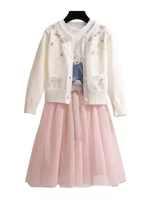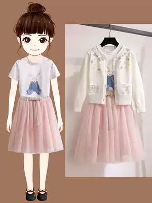 Girl spring suit 2021 New Baby Girl T-shirt female baby Net red style Net gauze dress two-piece set