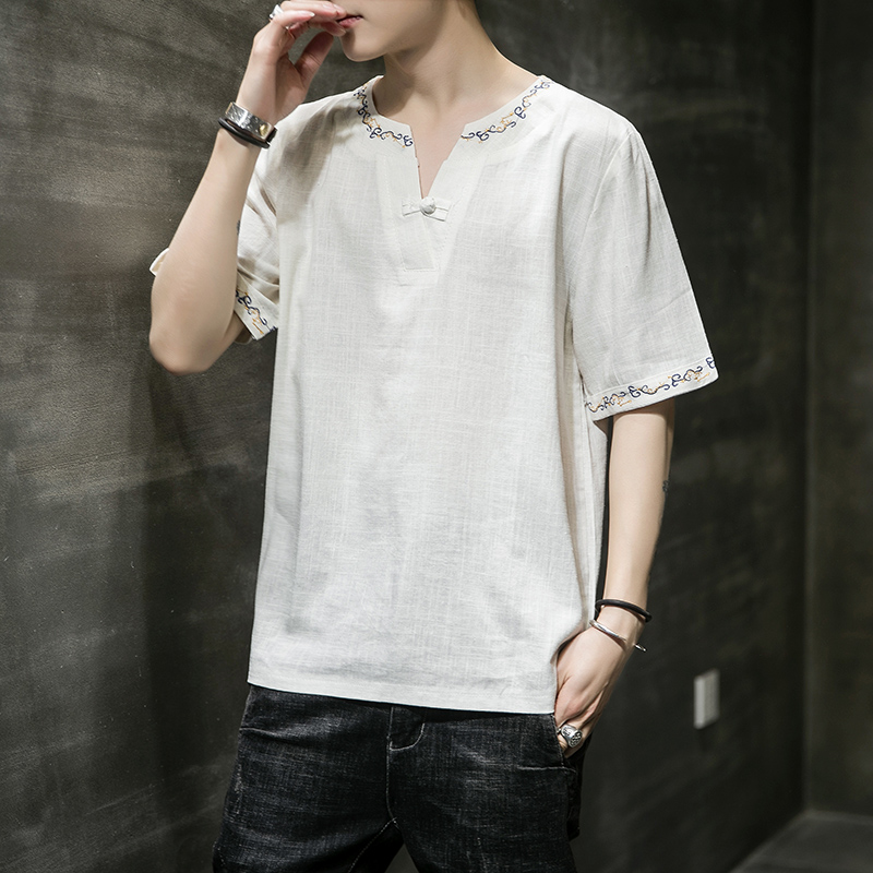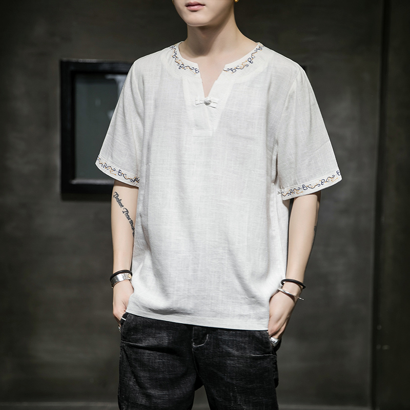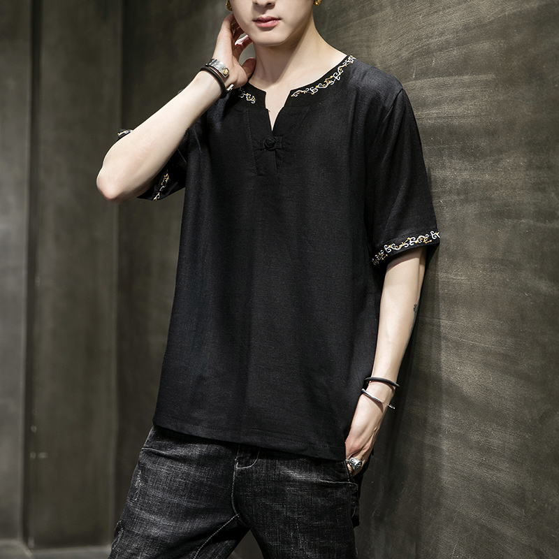 Summer Chinese style linen T-shirt men's short-sleeved V-neck retro cotton and linen clothes Youth Tang dress large size trend fat man