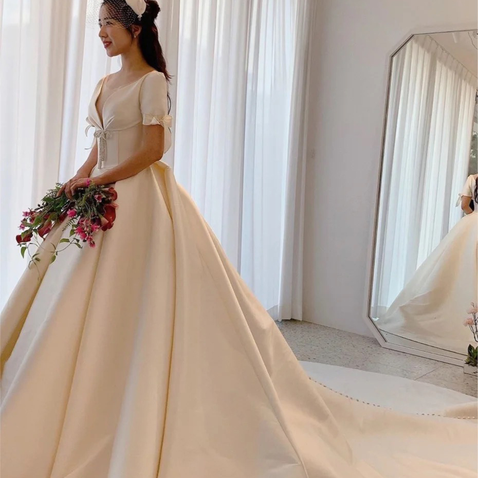 Korean-style palace satin wedding dress 2021 new bride Hepburn style short-sleeved V-neck princess dream simple