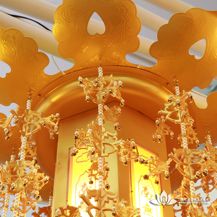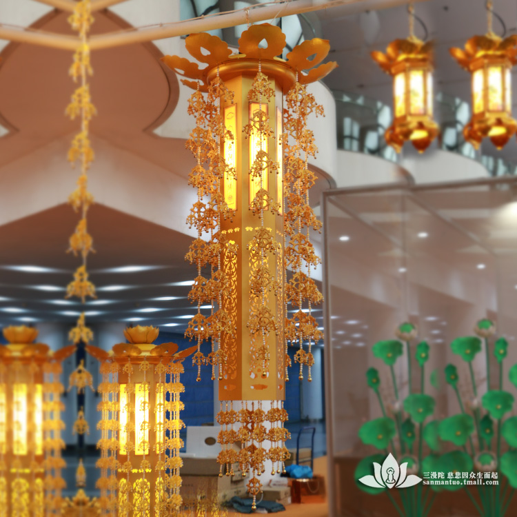 Three comic books for the Buddha decoration for a home swing piece of gold and silver hanging lanterns for the Buddha lamp by a block of buildings in a temple.