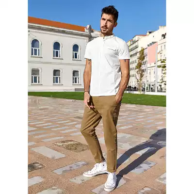 Kuegou men's collar short sleeve T-shirt men's summer light and comfortable simple solid color slim stitching top 5735