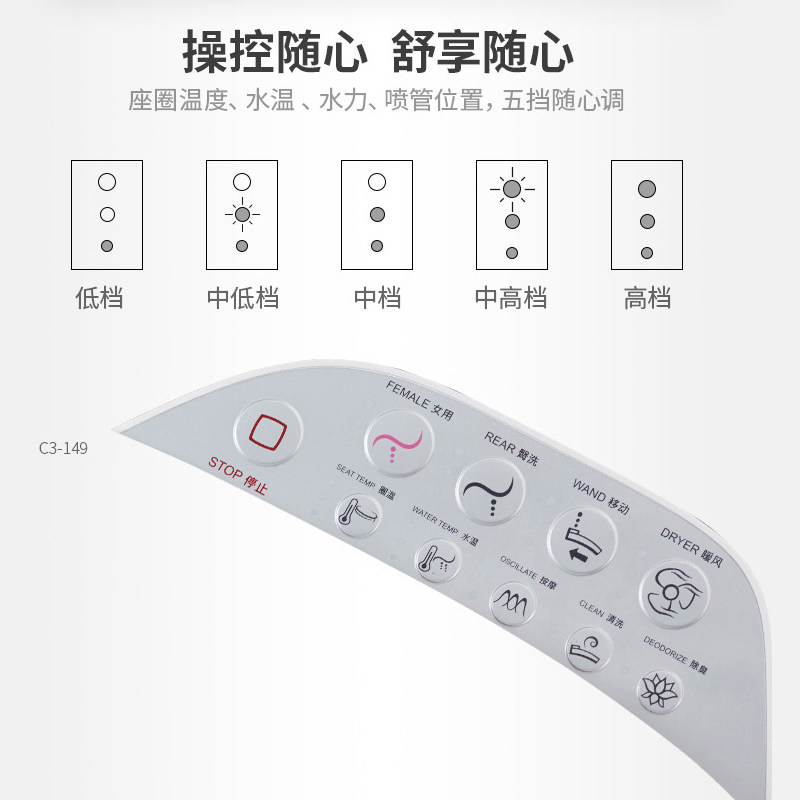Butt wash Female wash Seat ring Heating water temperature adjustment Water pressure adjustment Warm air drying nozzle Self-cleaning automatic deodorant nozzle Mobile cleaning Instantaneous heat type